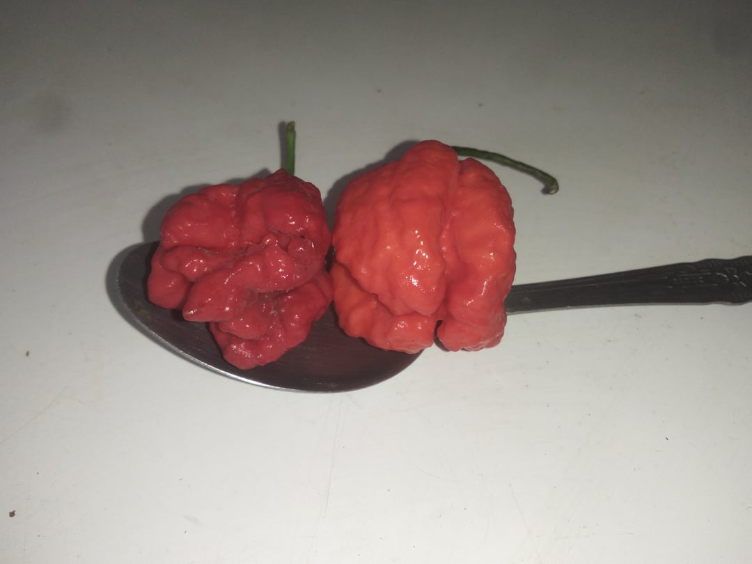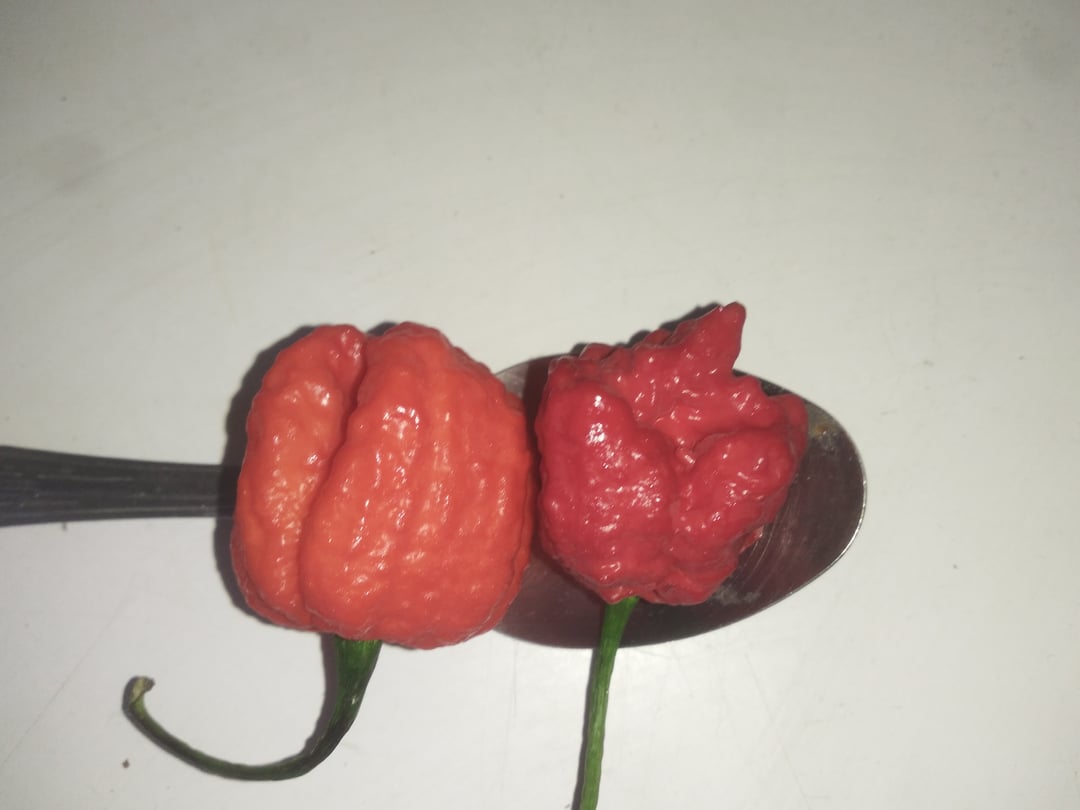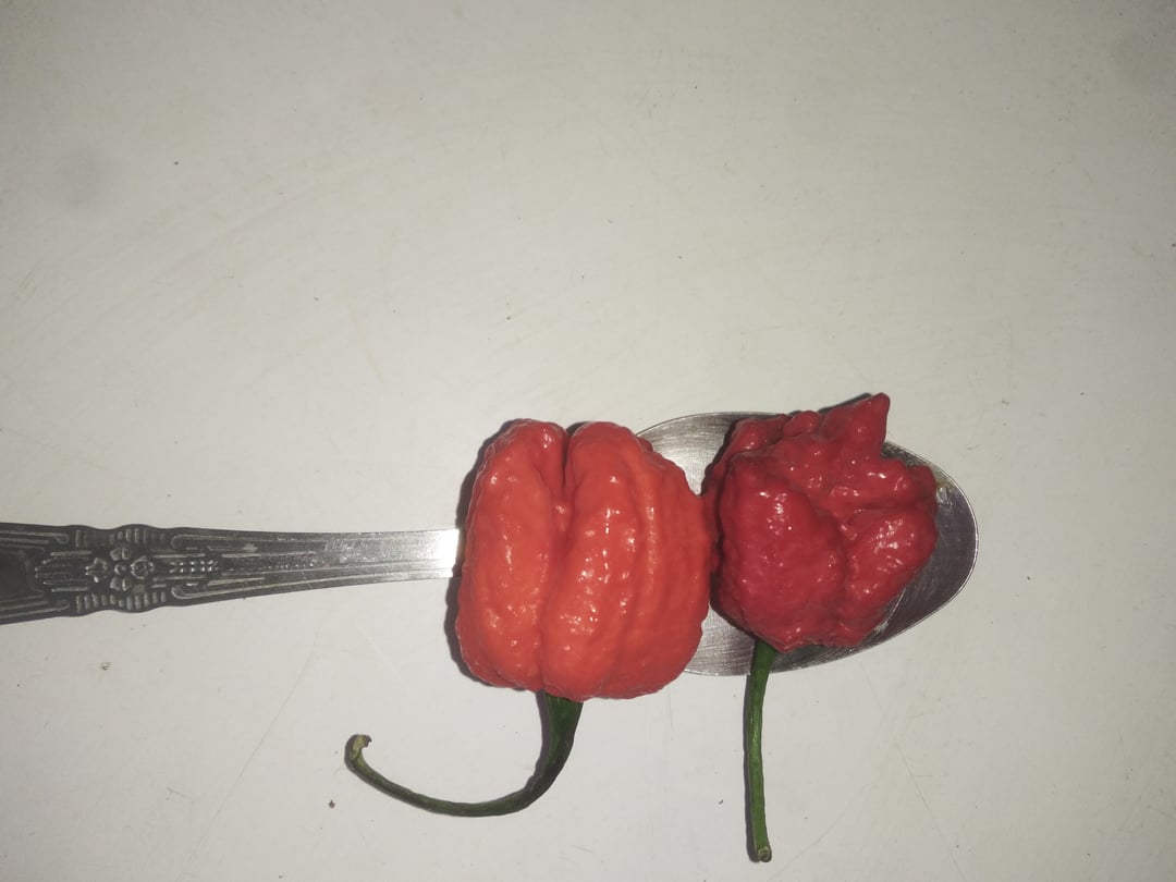 Guessing and AI appears to agree with me Trinidad Moruga Scorpion (left) and a Carolina Reaper (right).