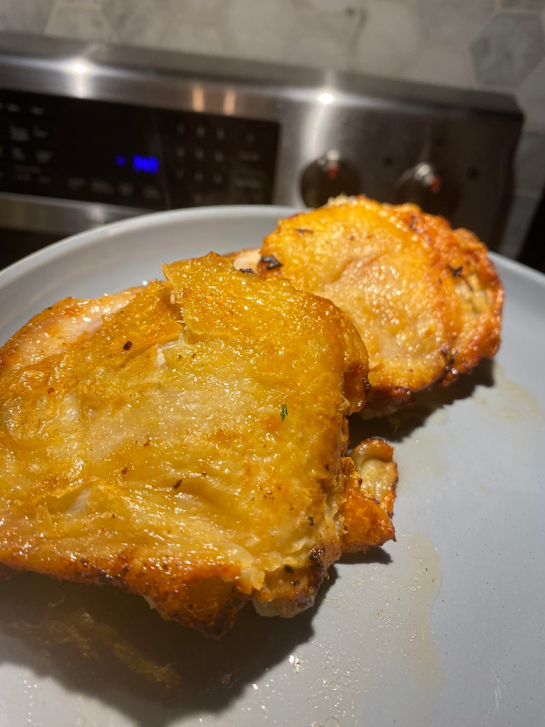 Add salt to ONLY the skin side, season flesh side to taste. Place skin side down on a COLD (yes cold) cast iron pan or stainless steel. Turn heat to medium, this allows the fat so slowly render out, which will lead to the crispiest skin. Render out for about 15 to 20 minutes until golden. They say the skin should naturally release from the pan at this point but don’t worry too much if it doesn’t, mine didn’t but it tasted great. Flip over and now the recipe says to add rosemary, thyme,or garlic etc. etc. but I added mine as the skin was cooking. After about 3-5 minutes remove the thighs once they reach 175 internal temp. Enjoy! :))