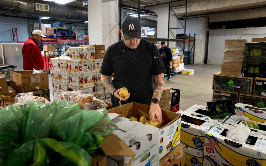 Eric Bufo inspects a box of onions that just arrived at the Wayside Foods Programs warehouse. Bufo’s meals depend on donated food that the program receives on any given day. (Gregory Rec/Staff Photographer)