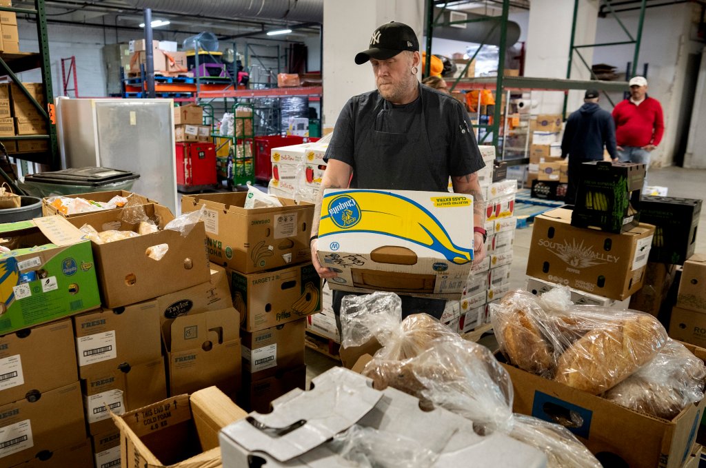 Eric Bufo, chef at the Wayside Food Programs in Portland, carries a box of onions through the Wayside warehouse. (Gregory Rec/Staff Photographer)