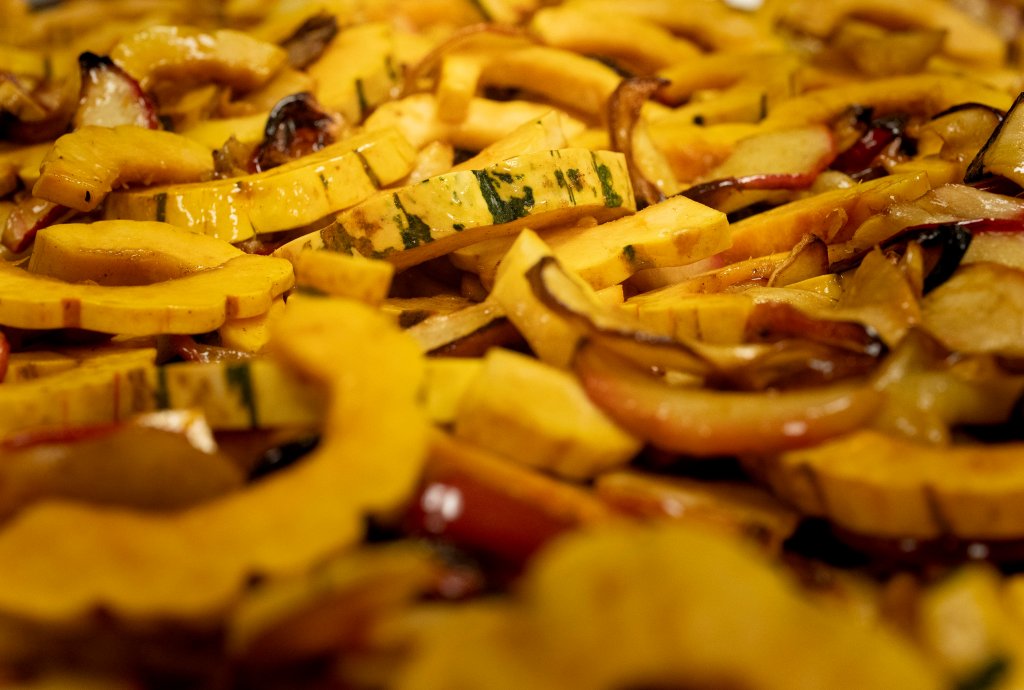 Bufo’s side dish in progress: delicata squash from R. Belanger & Sons Farm in Lewiston with Maine apples, tossed with Kerrygold brown butter. (Gregory Rec/Staff Photographer)