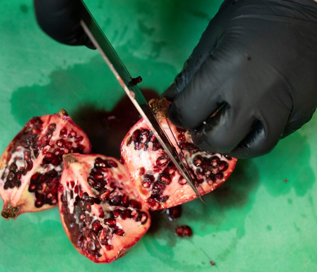 Eric Bufo cuts open a pomegranate to remove the seeds, with plans to turn them into a reduction, at the Wayside Food Programs kitchen in Portland on Nov. 11. (Gregory Rec/Staff Photographer)