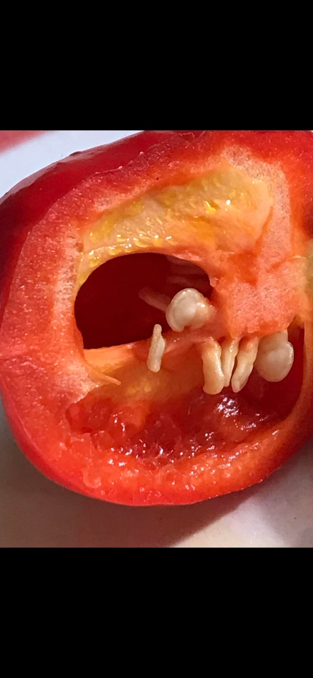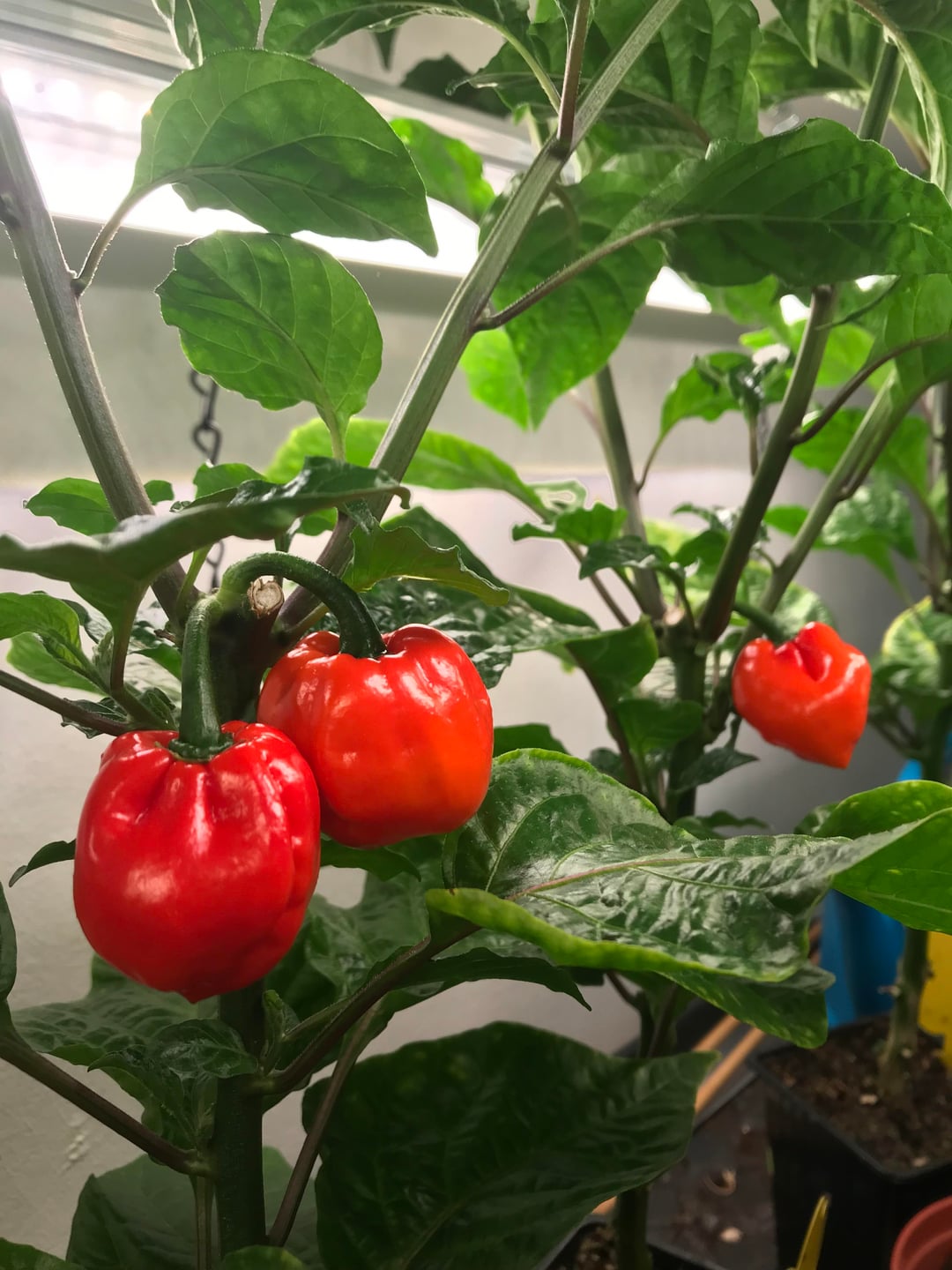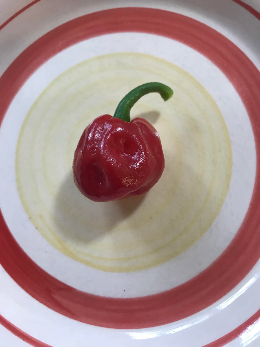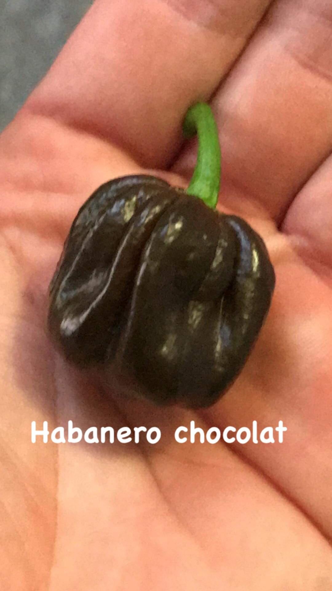 This is the result of a natural cross between a chocolate habanero and a petenero habanero. I've been growing chocolate habaneros for several years and have always saved my seeds from my garden. They have always been as supposed, brown and fairly uniform. But this time I had high expectations and a good feeling about it. The parent plants grew side by side and each had an intertwined branch. I saved the seeds from one of the chocolate habaneros, and here is the result a year later. This one grew totally inside and isolated from others peppers