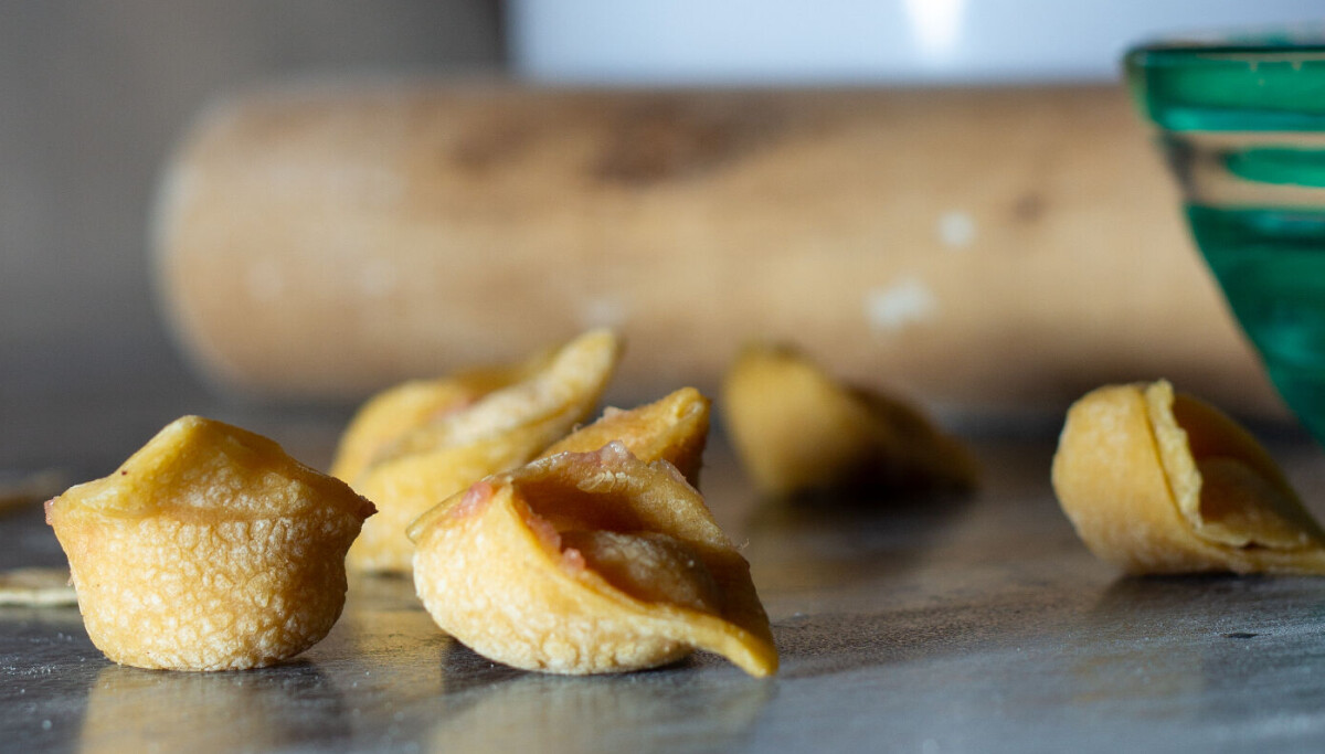 The whole family is a part of the process when tortellini is made, he continues. Usually, the dough is made prehand and frozen down.