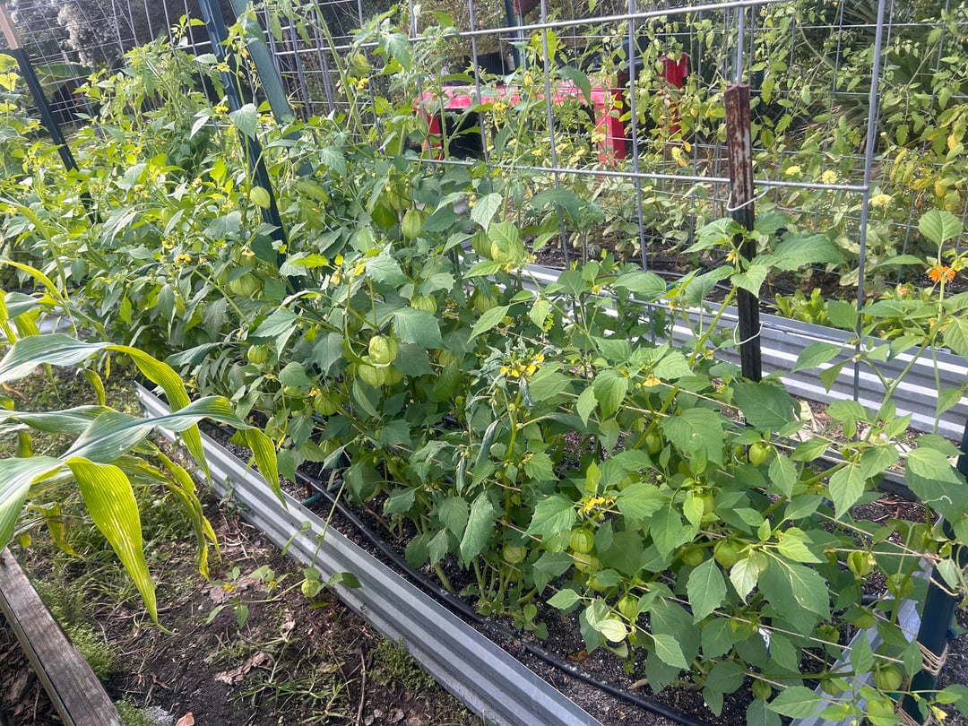 The amount of tomatillos I got off two plants stocked my freezer and pantry with so much salsa I will not have to plant them next year. Beautiful way to trellis them- they will break free.