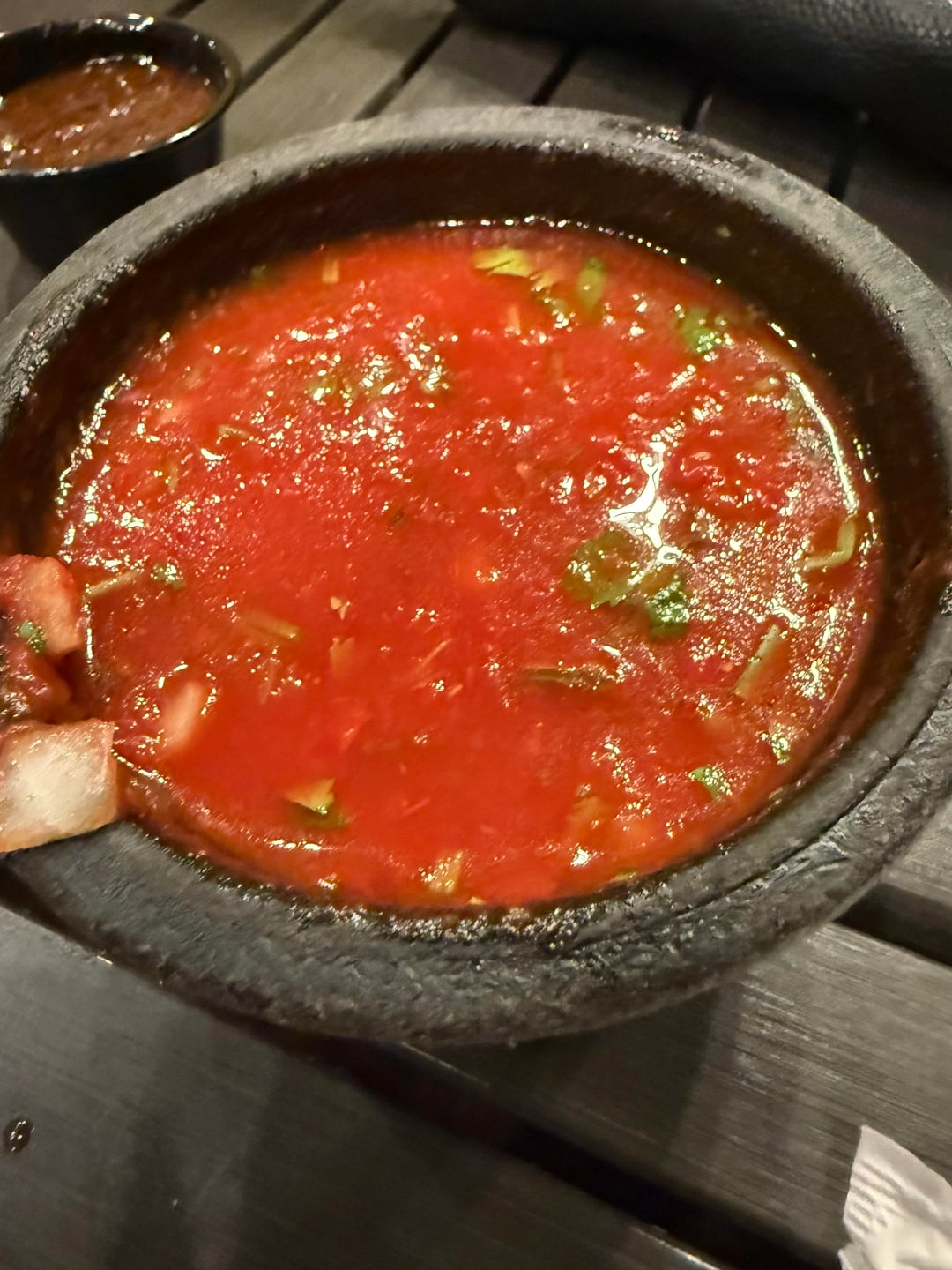 Maybe they add in a tomato sauce to make it less spicy. But the chunks of onion, tomato, and cilantro are definitely awesome in this style of salsa.