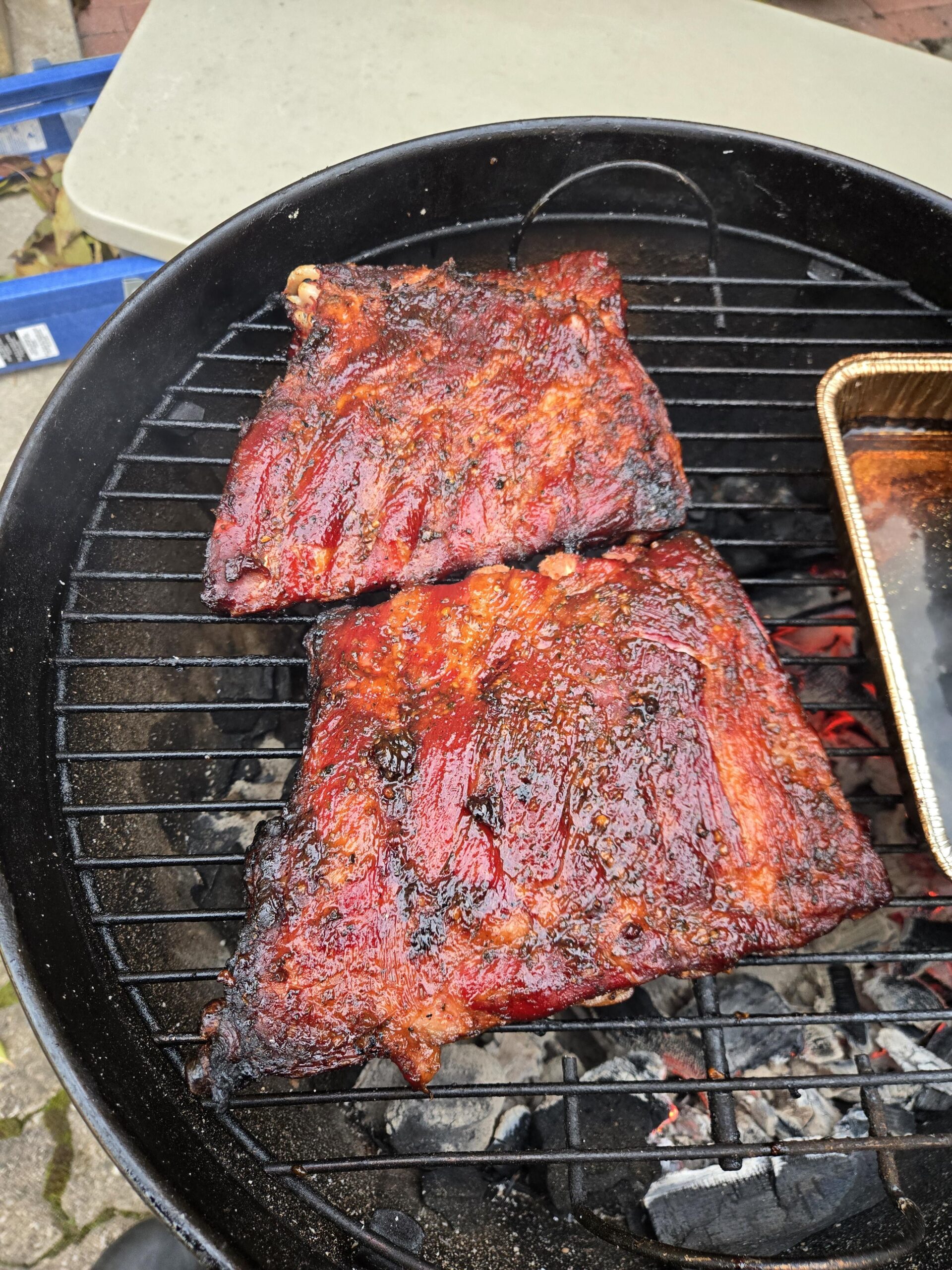 Ribs almost done, this one was tricky on the 18" but looking solid. Sitting around 190 as I unwrapped them. Another 45 mins and it's dinner time. by argte 3 Comments NMUWildcat 6 hours ago Nice … Very nice. They look awesome! Nedstarkclash 6 hours ago Beautiful. And yes, I agree! JohnnyG789 6 hours ago I have a rib rack I use on my 22 that stand them up on their side and I put the coals on the other side for indirect cooking.