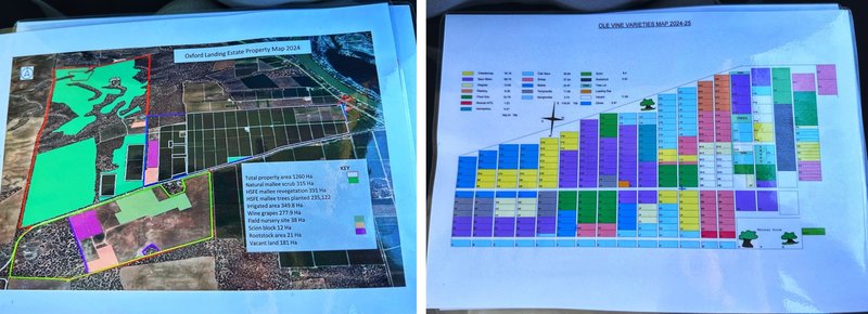The Oxford Landing Property by use-case (bright green is mallee scrub as part of its one square metre planted for every six-pack sold initiative)(left); The vineyard by variety (right)