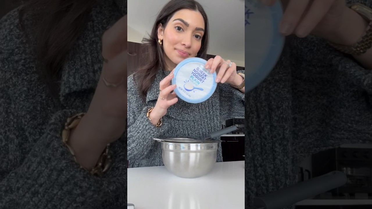 Today we’re making lemon from Greek yogurt at home cuz it’s so easy to do. Just need a colander with a bowl to catch the water that strains underneath and then place a cheesecloth above the colander and then pour your Greek yogurt right in the center so that it strains through the cheesecloth through the colander and the liquid catches in the bowl. Just twist up your cheesecloth and then you can place everything in the fridge for a day to strain overnight. After a day in the fridge, you’re left with a little bit of liquid that strains out of the yogurt and the thickest lemon that you can use for toast, spreads, or whatever else you want. Pop it back in a container for up to 1 week and taste how delicious and tangy it