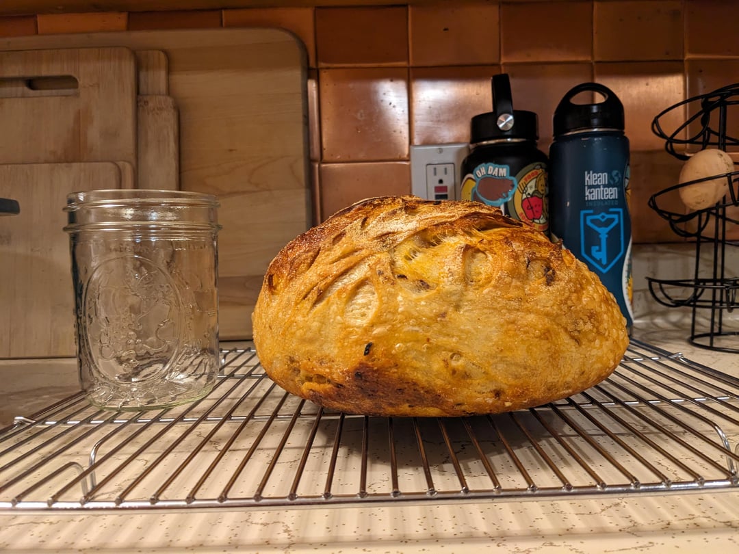 Rest 45 min, start stretch and folds. Second stretch I added 2 Tblsp chili crisp, then continued s&f until I had four, about 45 min apart. Left on counter in ~65° kitchen. Slept. (It was late)