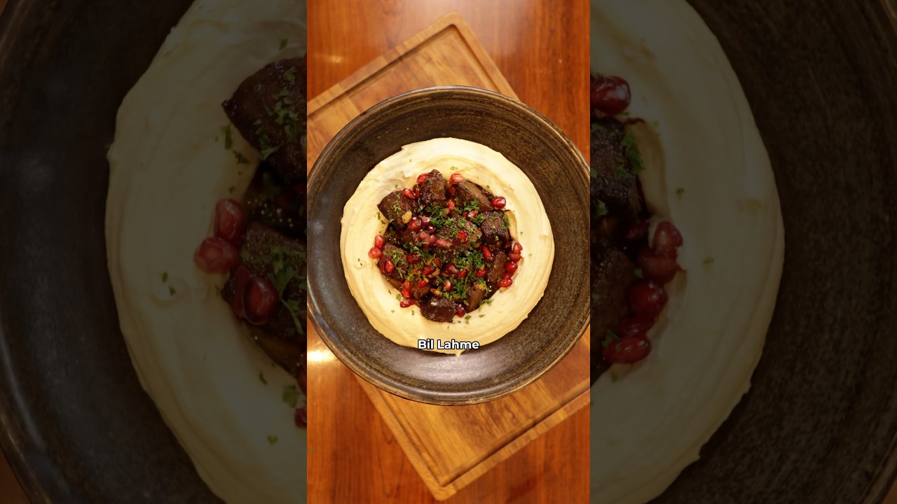 Dinners that impress without the stress. Hummus bame. One pan, one blender, and 30 minutes to make a deceivingly simple meal. Now, I think hummus is a lot easier than people give it credit for. The biggest mistake I used to make was not adding enough tahini. As a general rule of thumb, half the weight of chickpeas in tahini. Tahini goes into the blender first, lemon juice next. Good pinch of salt. Then give it a blend until it comes together. Then add your chickpeas. The final step for the smoothest hummus is ice cubes. It kind of acts like a binder and makes it super velvety. And with the hummus done, we’re already halfway. Just the spiced beef to go, which we’ll first just cube up some marbled steak. And a big thank you to Kato for this gorgeous knife. Toss it in salt and spices. Then give it a super quick flash fry in either hot ghee or olive oil if you don’t have it. Finish with some pine nuts and pomegranate molasses and you’re finished. Spoon it into a swirl of creamy hummus with pomegranate and parsley for a bit of freshness. By the way, you could also do the exact same thing with chicken. Either way, just scoop up mouthfuls with hot flatbread or pitter or even rice. Man is so good.