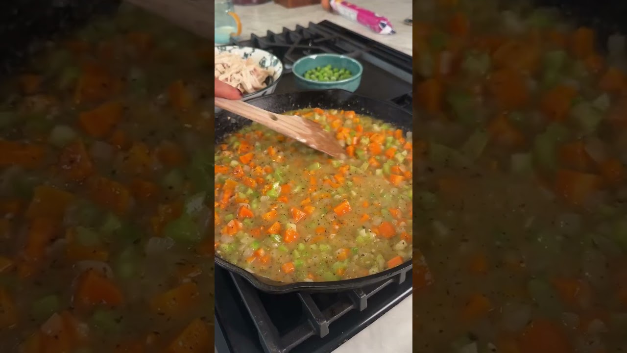 the easiest dinner that comes together in 30 minutes! Meet my skillet chicken pot pie topped with flakey puff pastry #easydinner #easydinnerideas #dinnerrecipe #easycookingrecipes
