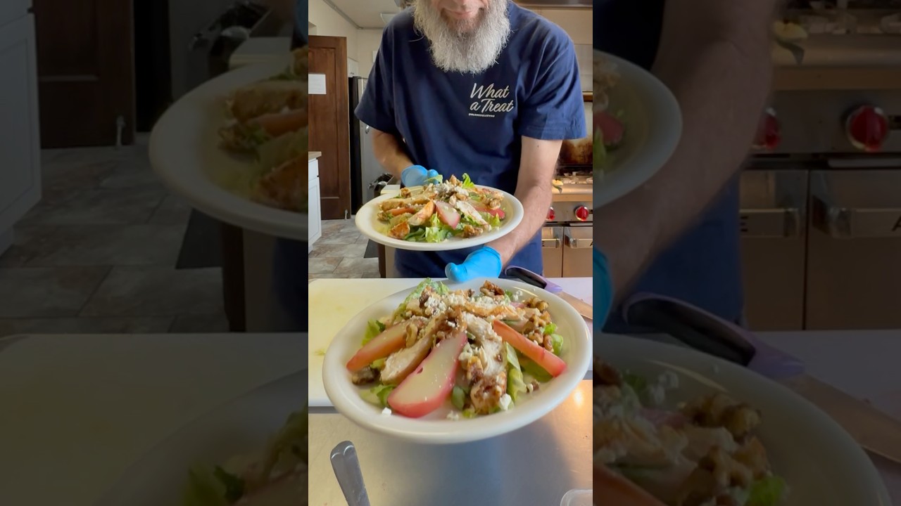 poached pears, candied walnuts, and raspberry vinegarette. Guys, it’s salad day and we’re starting with the pears. I got cranberry juice going down in my pan. We’re going to grab those pears and peel them up. I just take the skins right off. Then I’m going to split these things right in half. Throw them into that cranberry juice. We put them on medium heat. We let them poach till they’re fork tender. Guys, when they’re done, just pull them out, let them cool off, and they look like that. They’re beautiful. Let’s go ahead and make this dressing. It starts with the raspberry sauce. I got frozen raspberries. Little bit of sugar. And I’m going to add some lemon juice. One little splash of water. We throw that on the stove and we’re going to let that whole thing come to a simmer. That’s all it takes. Add a little bit of cornstarch. Let that thicken up. Then I’m going to go ahead and press that through a strainer. Just pour it right in. And I use my whisk to stir it around. That’s it, guys. Let’s make the dressing. I got four eggs going into a bowl. Now I’m going to go ahead and use this avocado oil. I drizzle it in. It’s almost like we’re making a mayonnaise. That’s going to start thickening up. I use some red wine vinegar. It’s going to add a nice tart tanginess to it. Lots of sugar. About a half a cup cuz I want this to be a sweet dressing. We throw in that raspberry sauce, guys. Give that a stir. Our raspberry vinegarette is ready. Look at that, guys. It’s beautiful. It’s got the great consistency. Let’s go ahead and candy our walnuts. These are a lot easier than you think. Melt a stick of butter. Add in about 2 cups of brown sugar. Super simple. Pinch of salt. Let those kind of come together. Let that sugar melt down. Then add in your walnuts. Give that nice little tossy toss. That’s all it takes. Those are ready. I’m going to put them down on a pan to cool. And first I’m going to hit them with a little bit of regular sugar. That’s just going to stick to that outer edge while it’s kind of sticky. That’s perfect. Set those aside. Let’s do some chicken. So, little bit of avocado oil. We’re going to add this seasoning. It’s this chicka chicka bam bam seasoning rub. Put that on there. Mix it all around. I got my griddle nice and hot. We’re going to go ahead and throw these right down there. Get a nice crust on one side. Go ahead and flip them over. Let it get crusted on the other side and cook all the way through. And we’ll build a salad. I’m going with Roma. The first thing we add is that raspberry vinegarette. Just kind of swirl some right on the top. Then we’re going to go ahead and cut these pears. I like to cut them in about four different slices. I layer out those pairs right on my salad. Then I take those chickens and cut those in about four or five slices and those go in between the pairs as we hit those candied walnuts on there. Next, we’re going to finish this with some gorgonola cheese. If you don’t like the gorgensola, just leave it off. But look at that, man. Just get in there and enjoy. What a treat. Thanks for watching.