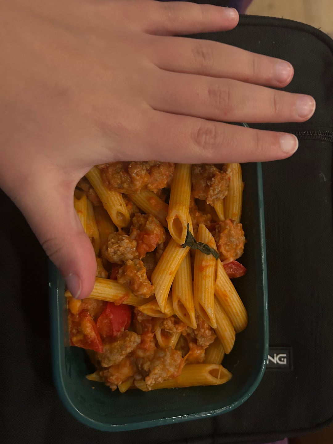 barilla penne pasta, rao's vodka sauce, italian spicy sausage, red bell pepper, mozzarella tillamook, tomato some garlic and basil. all made without oil