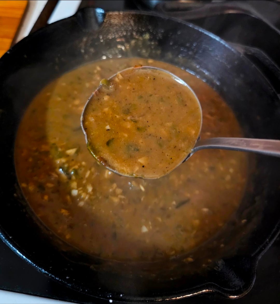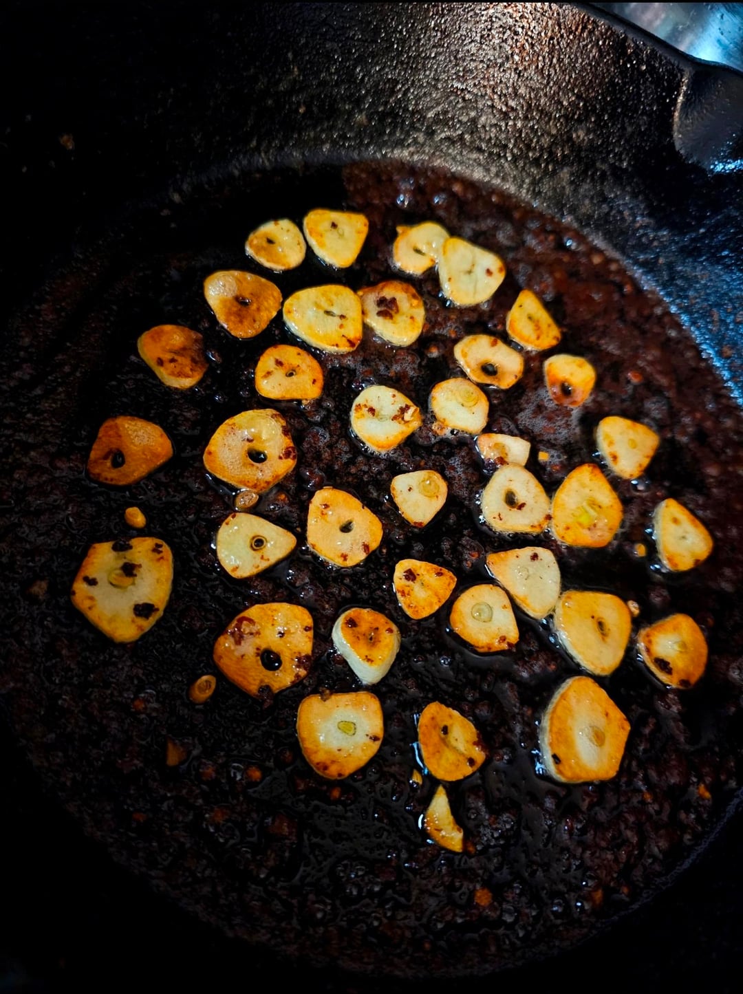 The garlic/herb olive oil is optional but I got a bunch of fresh herbs from a friends garden and was planning to make it anyway, so throw a bunch of minced garlic and fresh sprigs of rosemary & thyme into a pot of olive oil on low-medium heat and let it chill on the back burner while everything cooks.