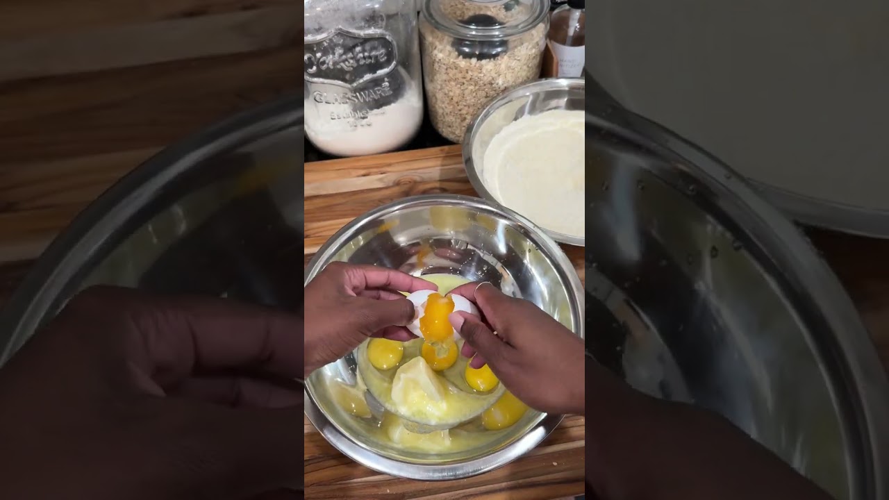 Save this cornbread recipe and promise me you’ll use it the next time you need to make cornmeal. The recipe is really easy. You’re going to start with two cups of yellow cornmeal. Next, we’ll add in two cups of allpurpose flour, 1 cup or maybe a little bit less than a cup of granulated sugar. I’m not the biggest fan of super sweet cornmeal, but I’m not making this for myself, so you got to give the people what they want. 2 tbsps of baking powder and 2 tsps of salt. Make sure your baking soda is not old. If it is old, you might get flat, not fluffy cornmeal. In a separate bowl, I’m going to mix one stick of butter, four eggs, two cups of milk. Now, I’m using lactate cuz that’s just what I have in my house, but you can use whole milk or I’ve even seen people use heavy whipping cream. There is also 2/3 cup of vegetable oil in there. Mix that together really well. And then pour your wet ingredients into your dry ingredients. Your batter should be fairly thin. Now, I stick a big glob of butter in my baking dish and then stick it in the oven while it’s preheating. And while the butter is sizzling, I pour in the batter to get a nice crunchy bottom. My oven is set to 400°. While that’s cooking, I’m going to make a hot honey to go on top of it. It’s just melted butter and hot honey. When the cornbread is halfway done cooking, which is like 20 minutes in, I’m going to pull it out. I’m going to pour the hot honey mixture on top and then stick the bread back in the oven for another 20 minutes until it’s nice and golden brown and crunchy. He served it with some whipped butter honey, which I’ll show you in the next