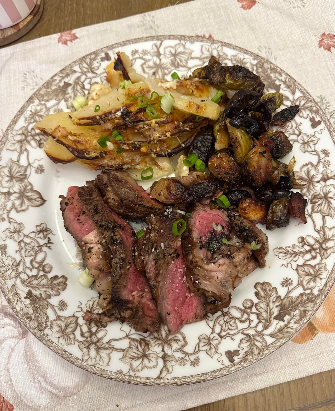 Fifth picture is a simple meal (bad pic though) of seared steaks, brussels sprouts, and scalloped potato gratin (alla NY Times/Kenji Lopez recipe). I made an NY Strip and a ribeye and both were good. The potato gratin was awesome. I made my fiancé roast potatoes, but he enjoyed the gratin as well.