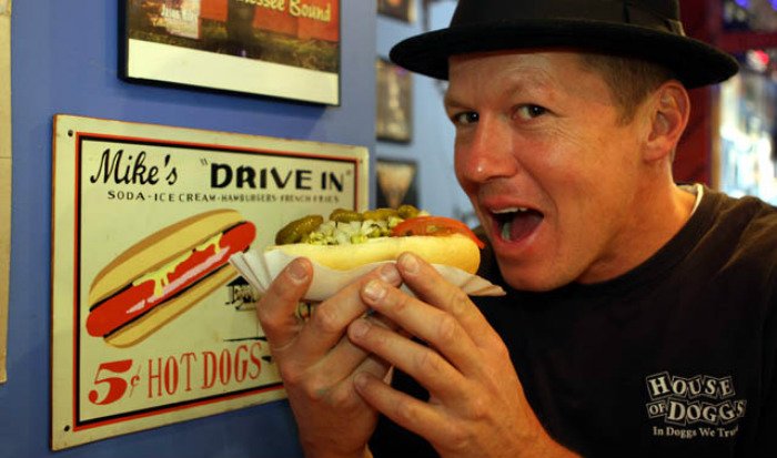 Across the street from the pastie shop is House of Doggs. Owner Nick McAllister has two loves: music and hot dogs. He combined these by adorning his walls with his musical collection and then set out to serve the finest natural casing hot dog. The result has been a thriving success and he has been rated the #1 Dog in town for 3 years.