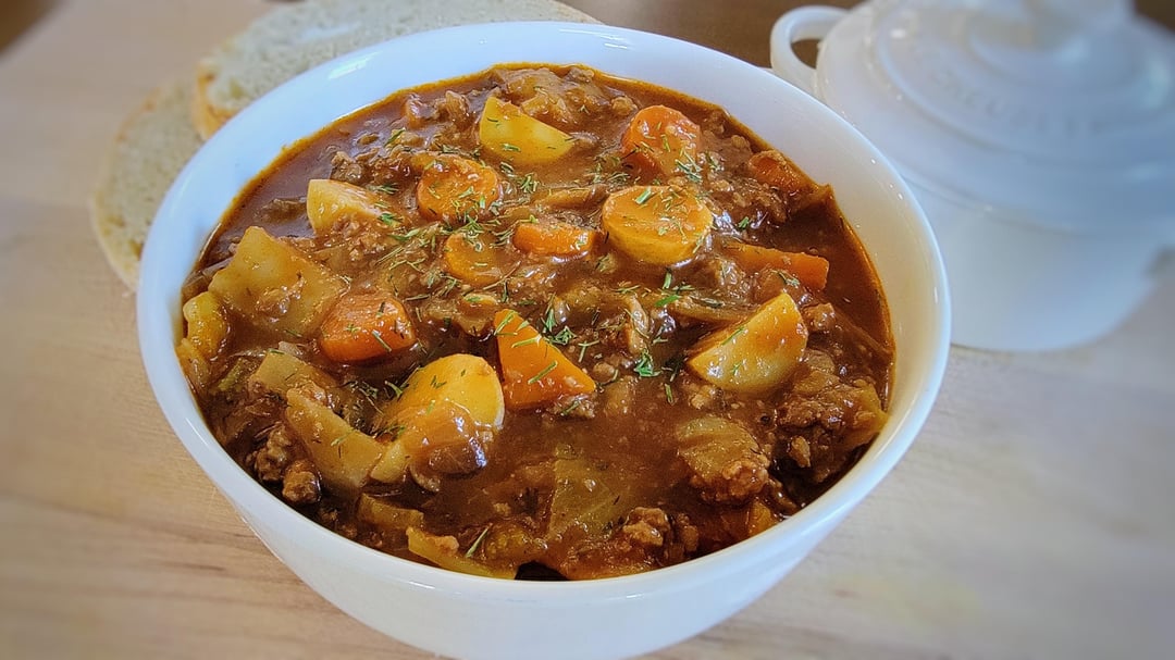 I like to make stew as an excuse to eat bread. This recipe embraces all the flavor of a meaty cabbage stew using plant-based ground and is a winner for vegans and omnis alike. My mom used to say let the Dutch oven tell you when your soup is ready. She was right; just simmer covered until the aroma fills the house, then it's ready.