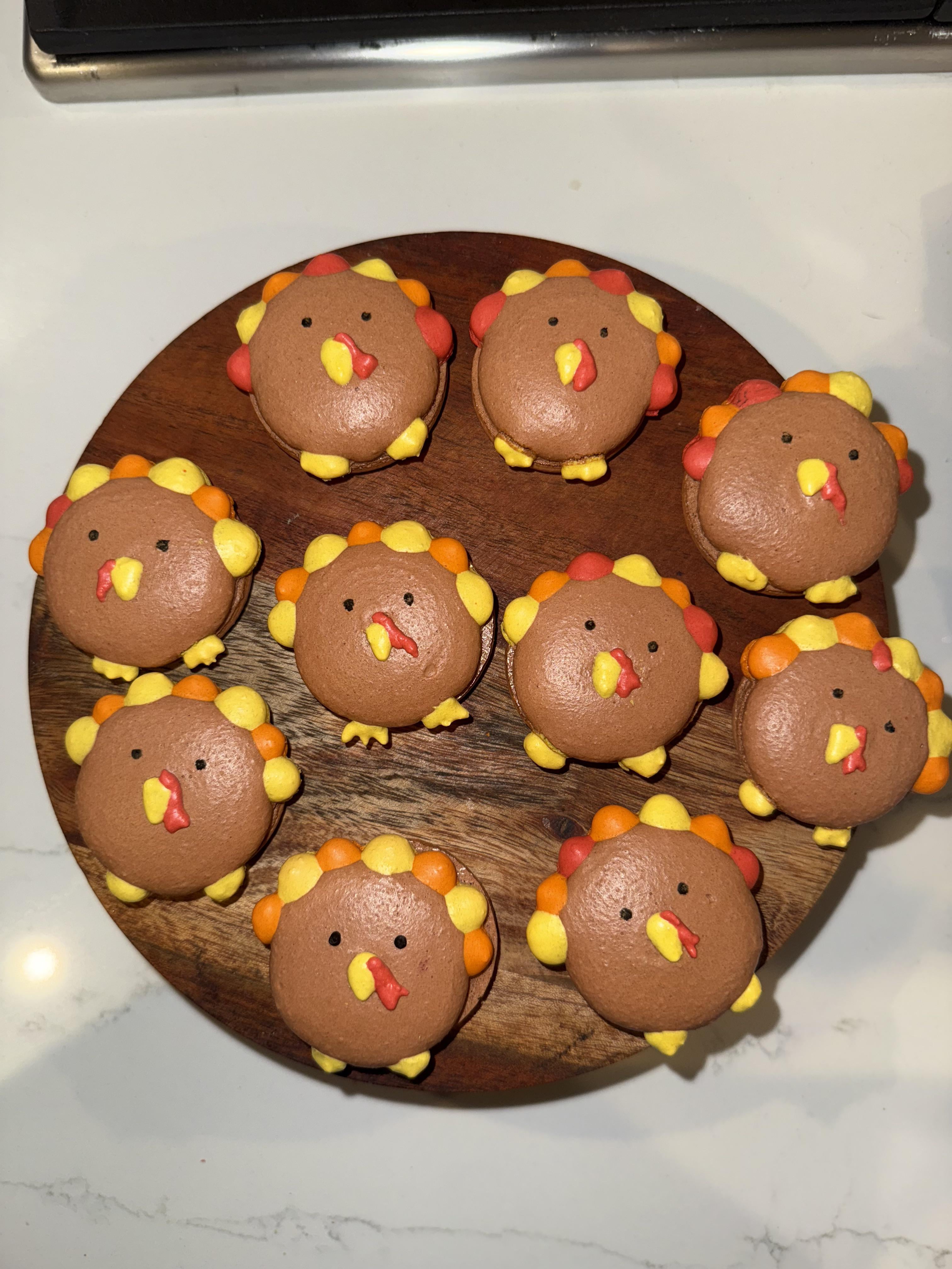 I finally found the right combo to get a full not overly sweet snappy shell. So now I can move on to the next mission of design. I plan on making a orange buttercream and cranberry center for these cuties