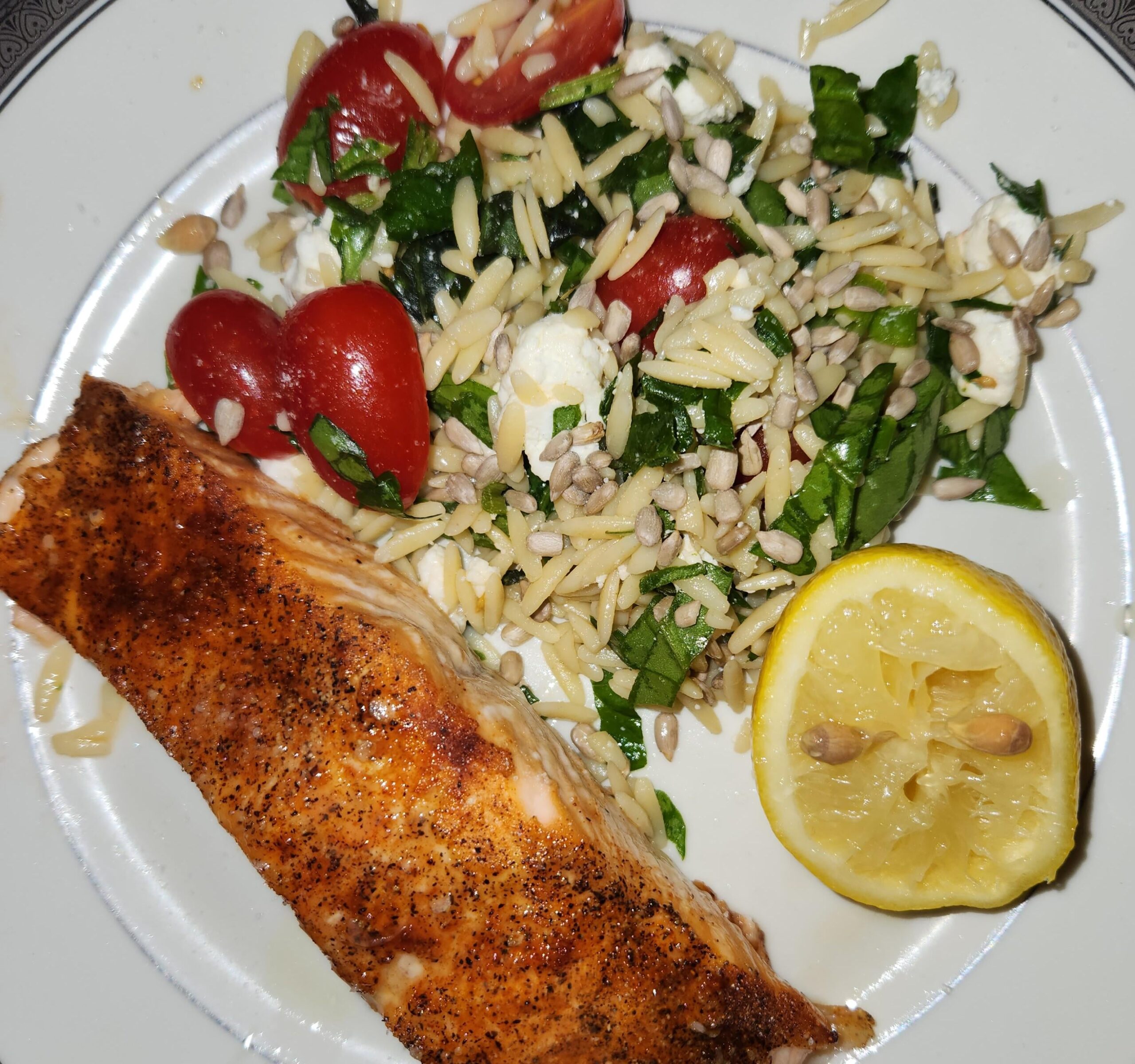 EU organic salmon (first time for me) marinated in honey, coconut aminos and Dijon, dusted with salt, pepper and paprika. Spinach orzo salad with tomatoes, goat cheese and sunflower seeds.
