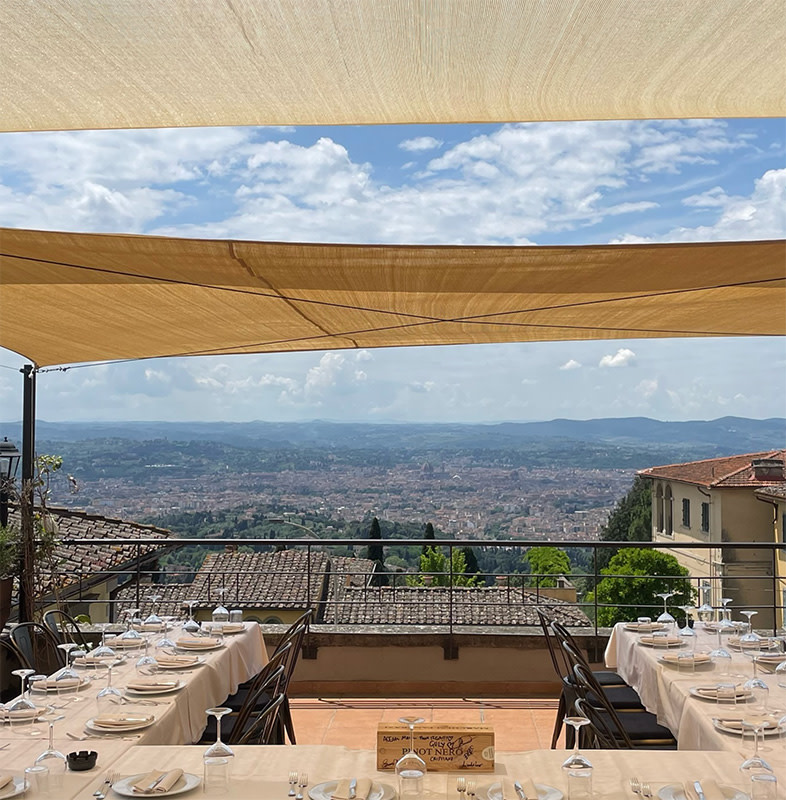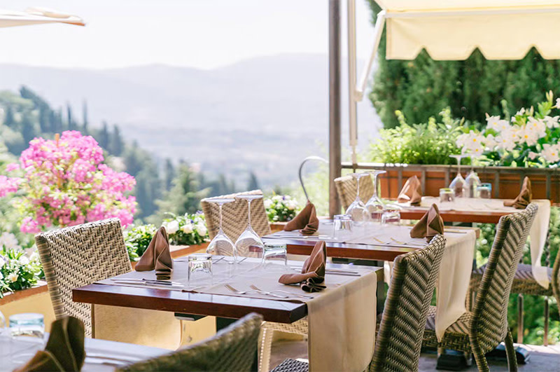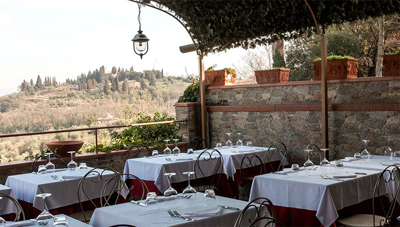 La Reggia degli Etruschi — once a monastery and later a tea room — is today one of the most exclusive restaurants in the city, offering a breathtaking view of Florence thanks to one of the most scenic and panoramic terraces in Fiesole. Inside, there are two spacious dining rooms with terracotta floors, wooden beam ceilings, and large, luminous windows, while outside extends an unmissable two-level terrace surrounded by flowers and greenery. La Reggia degli Etruschi is also renowned for its wine cellar, featuring a selection of the finest Tuscan wines curated by Leonardo, the restaurant’s grand chef and sommelier. The kitchen offers traditional Florentine dishes reinterpreted with a modern twist: from the delicious beef carpaccio with arugula, parmesan shavings, and thin strips of mango, to tagliatelle with black truffle, homemade gnocchetti with Roquefort cheese and white pepper, Angus steak with black truffle and strawberries, and fillet with lardo and truffle. Exquisite dishes to be savored with an absolutely enchanting view.