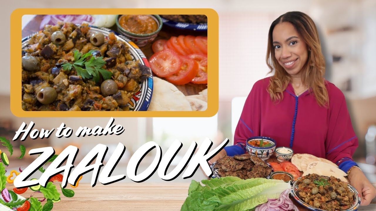 Welcome back to my YouTube channel, you guys. Today we’re starting a series of Moroccan salads/ dips. And today I’m going to show you guys how to make the famous zaloo, which is an eggplant dip that is one of my favorite things to make. These salads/ dips can go with any Moroccan entree. And this one I’m going to show you first because it is most special to my heart. It’s super simple, minimal ingredients, and I’m going to show you guys how to make it. If you like these types of videos, make sure you like, subscribe, and tune in for more for the rest of the series. Yellow, let’s go ahead and start. We’re going to start off by cutting our eggplant. You want to peel this eggplant maybe halfway. We’re not going to peel the whole thing cuz it is nice to keep a little bit of texture in the zaduk. So, I’m doing two eggplants here and doubling the recipe. I start off by slicing the eggplants into these long slivers like this and then cutting them into 1/2 in cubes. Next, you want to get a pan nice and hot with a lot of vegetable oil because we are going to be frying our eggplant. And it’s important to coat the eggplant in that oil so that they cook thoroughly. We’re also going to add a sprinkle of salt on the eggplant. That way, they cook down a lot faster. Now, while the eggplant is cooking, we’re going to start on our tomato sauce. So, we’re going to be taking some tomatoes, garlic, chopped cilantro, and you’re going to smash up your garlic. And I’m doing about three to four cloves here. Next, you want to dice up your tomatoes nice and fine. They’re going to all get cooked down anyways. Make sure to continuously stir the eggplant in between because you do not want it to burn. You can get a nice little caramelized skin there. Um, and in a separate pan, and you can do this all in one, but I like to do it in two separate pans. We’re going to start with our diced tomatoes and our crushed garlic. I’m quickly chopping up some of my cilantro so I can toss that in there as well. Now I have my three components for the sauce and I am going to get that mixed in very well. And then once that’s done, I can add it to my eggplant. Again, you could do this all in one pan. This is just my preference. Next up is seasoning. We’re doing paprika, cumin, and some black pepper. And even though we already salted our eggplant earlier, that was mainly to make the eggplant sweat. So, we are going to add more salt. And of course, make sure you’re tasting this throughout so that it’s not too salty for your preference. Continue to mix everything up. You want to make sure that the spices are evenly distributed. And that is pretty much it, you guys. I’m serving the saluk as alongside with some ka. And we’re making some ka sandwiches. You would never guess that this saluk was that easy to make. And I hope you guys enjoy this recipe as always. And until next time.