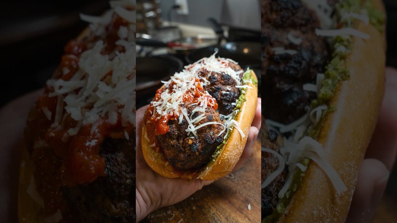 I hate meatball subs, but let’s see if we can change that. So, I usually don’t like them cuz they’re so one note in flavor and in texture. It’s like a marinara mush, and we can do better. So, check the description below for the details, and let’s start out with a basic marinara. After that, we’re going to go into a bowl with a pound of bircher pork and a pound of 8020 chuck. Now, that’s a lot of fat for a meatball, but it’s okay cuz we’re going to grill these. We’re going to grill them for a crispy crispy outside and a nice smoky flavor. And we’re going to lose a lot of drippings in the process. So, that’s why we got to have that extra fat content. So next we’re going to make a quick bashamel to bring a nice creamy nuttiness to it. It’s going to add a lot of richness to one side of the bun. And we’re going to add some crispy salami for texture and spice as well. Now when we get this assembled, we’re going to go bashamel and then pesto for a punch of acidity and freshness. Smoked proolone cheese. That crispy salami and oh oh my god, this is the most indulgent thing I’ve made all year and you should definitely try it. Enjoy.