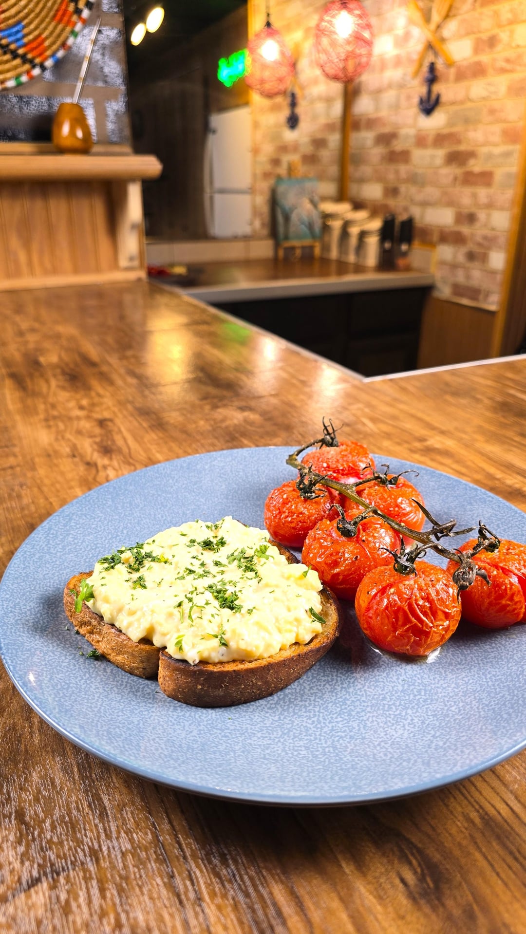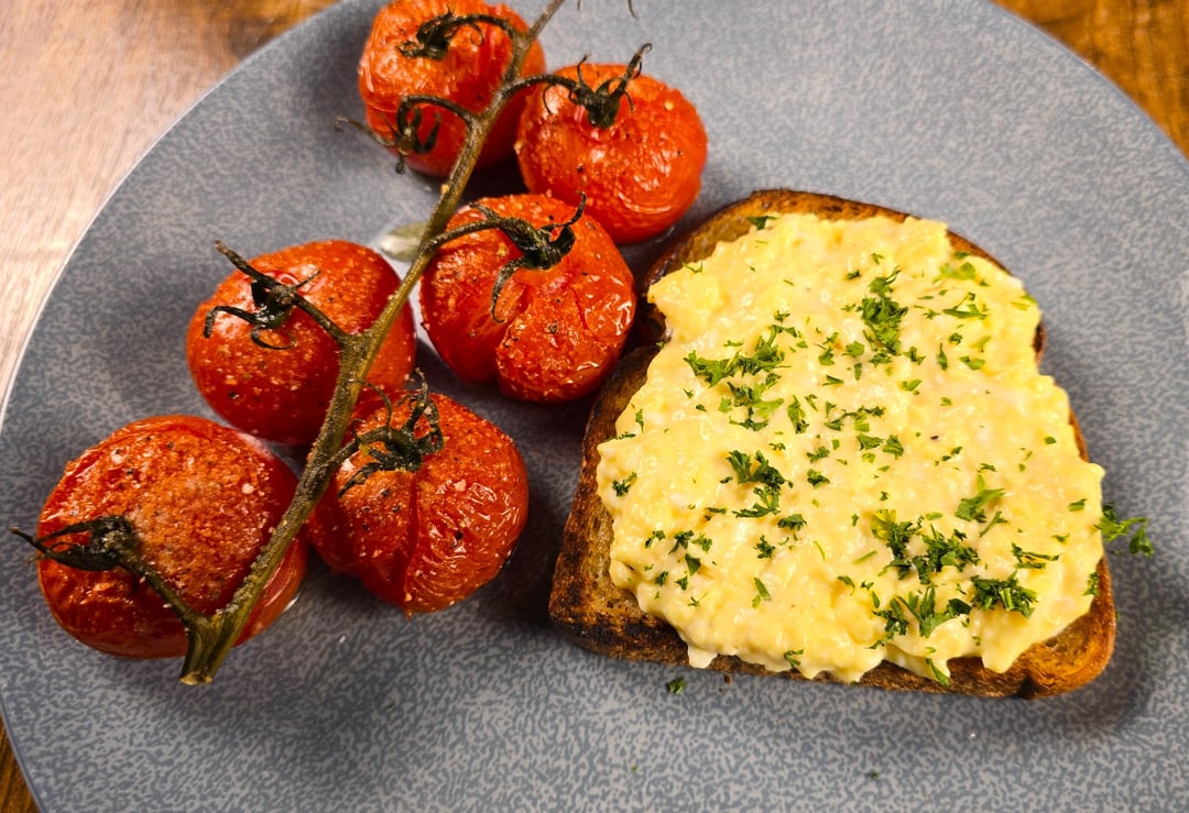 - Place the creamy eggs over the toasted bread. Add the roasted tomatoes on the side. Garnish the eggs with chopped parsley.