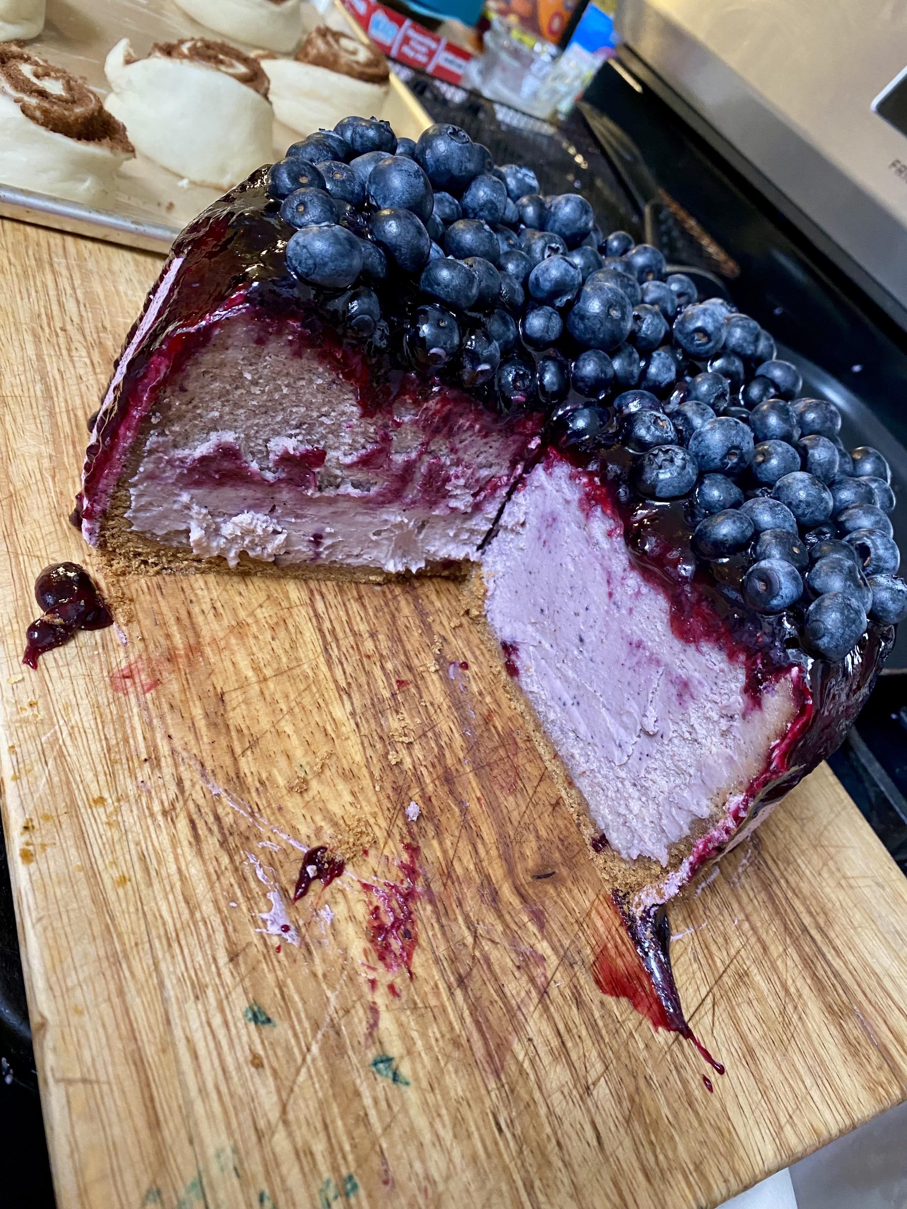 Not your typical plain cheesecake with syrup or compote on top . The batter itself is blueberry with a light blueberry buttercream exterior and a small compote blueberry top with a glaze finish and garnished with blueberry. I’ve improved the recipe this third try and it’s not too sweet and not too blueberry-ish. Perfectly balanced