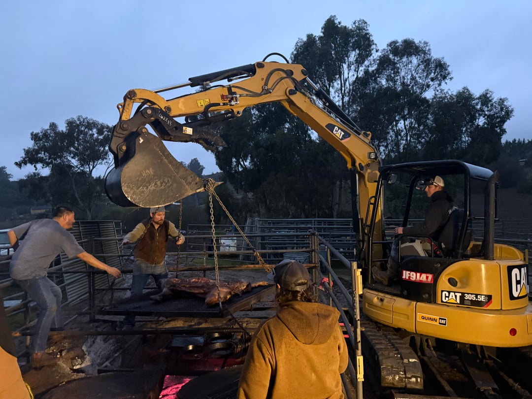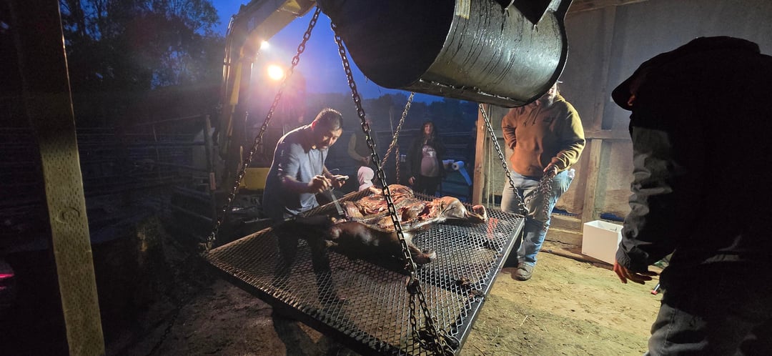 Biggest pig roast to date. Original plan was buried underground with leaves and burlap but rain forced us to build a raised pit from dirt, logs, river rocks for pit wall, alum sheeting for heat retention and rain cover, tailgate of a trailer as grill, etc. Needed a Cat to lift. The rain changed the plans many times. The flare up and need to retain heat further encouraged improvisation. This setup was able to keep temp from 220-260 with separate oven for charcoal. This bbq took a village of ideas and muscle. But this was the best roast pig so far so absolute success even though nothing went to plan.