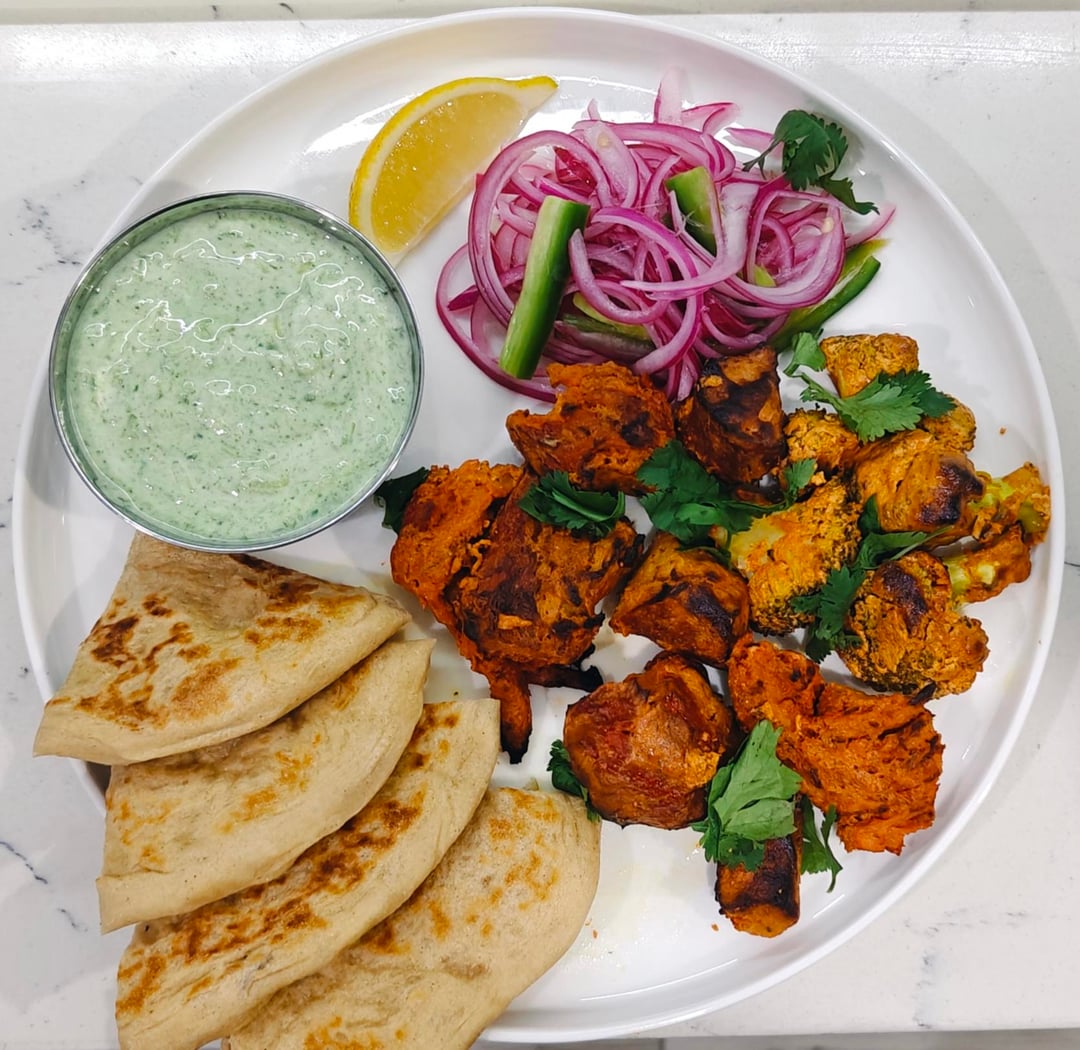 Full Fat Greek Vegan Yogurt, ginger-garlic paste, lemon juice, cumin, coriander powder, kashmiri chili powder, salt, kasoori methi (dried fenugreek leaves) rubbed between your hands to grind them, some cinnamon, green cardamom powder (I ground whole pods in a mortar and pestle, removing the green shell), lemon juice, a drop or two of the same red food dye as before (optional). Mix this all together, adjust to taste. It gets muted when it cooks, so make sure it's punchy in the bowl.