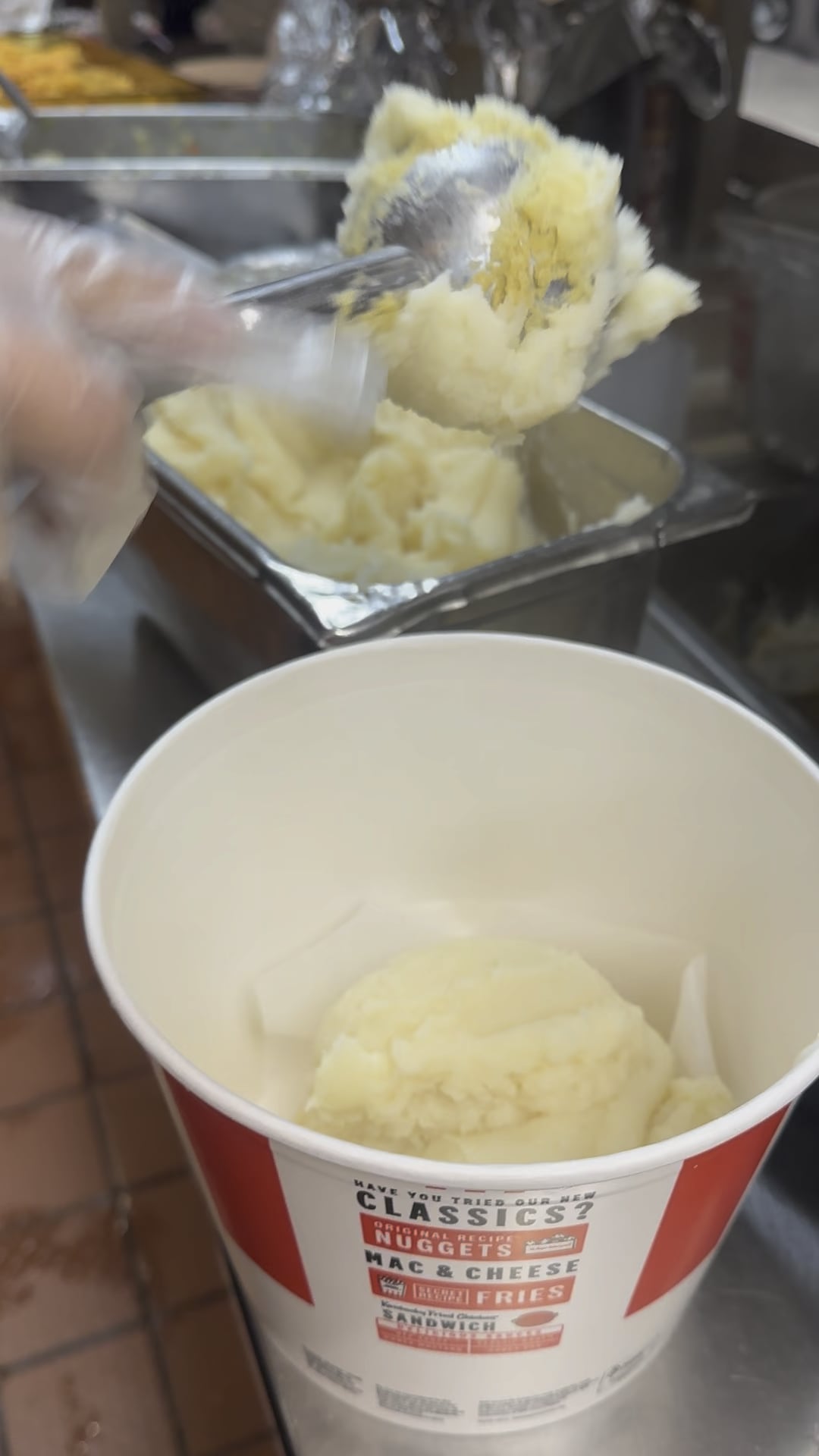 I bet this was right before closing. I used to work at KFC and its either throw it out or make sure to make fresh about 20 minutes before closing and I’d do this exact same thing. Less potatoes more corn waay more popcorn chicken. Im back and forth on how much gravy from time to time.