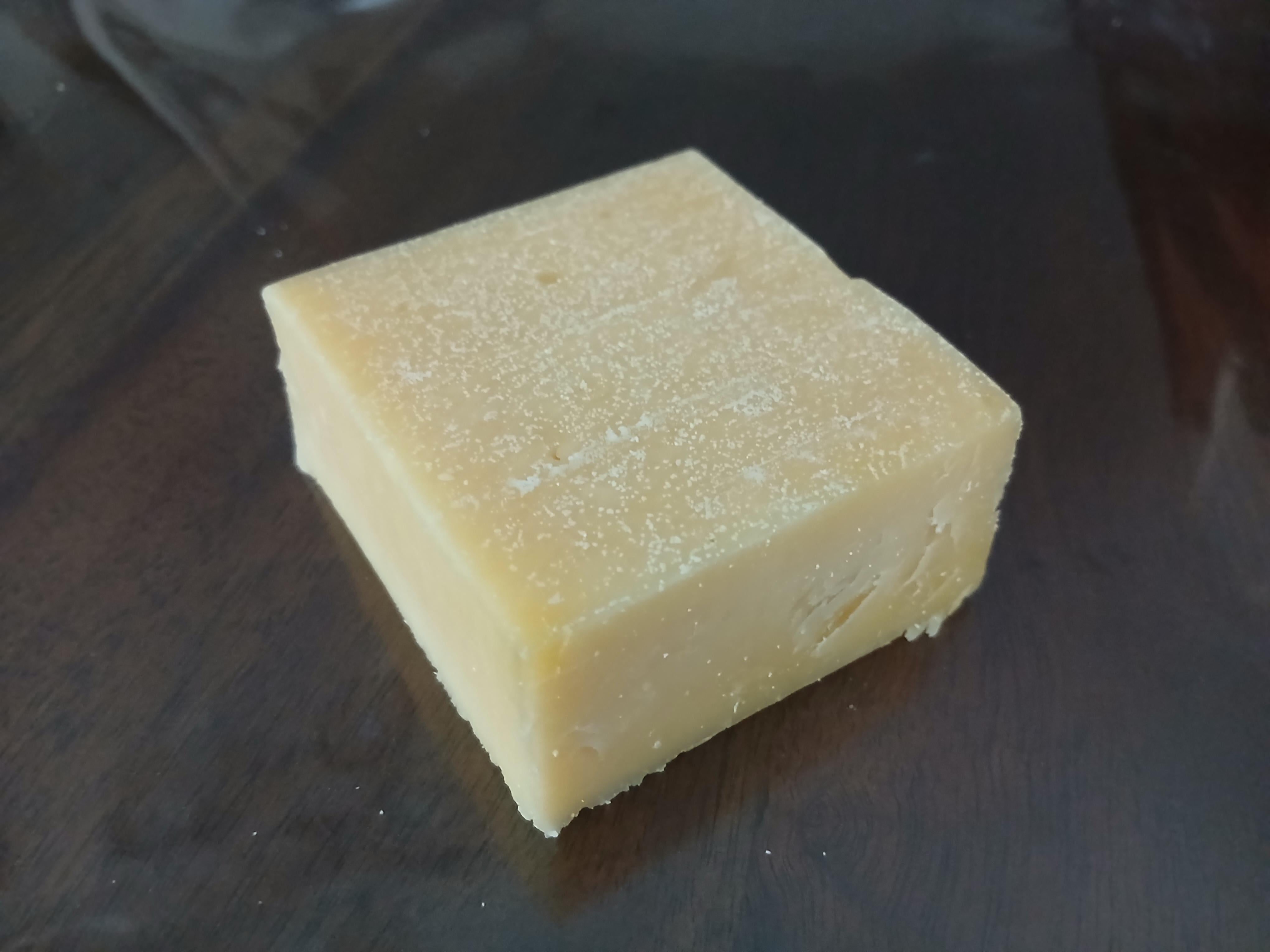 This cheese has a pineapple aroma. It tastes good, but the smell of it is a bit funky. It's a dry cheddar.