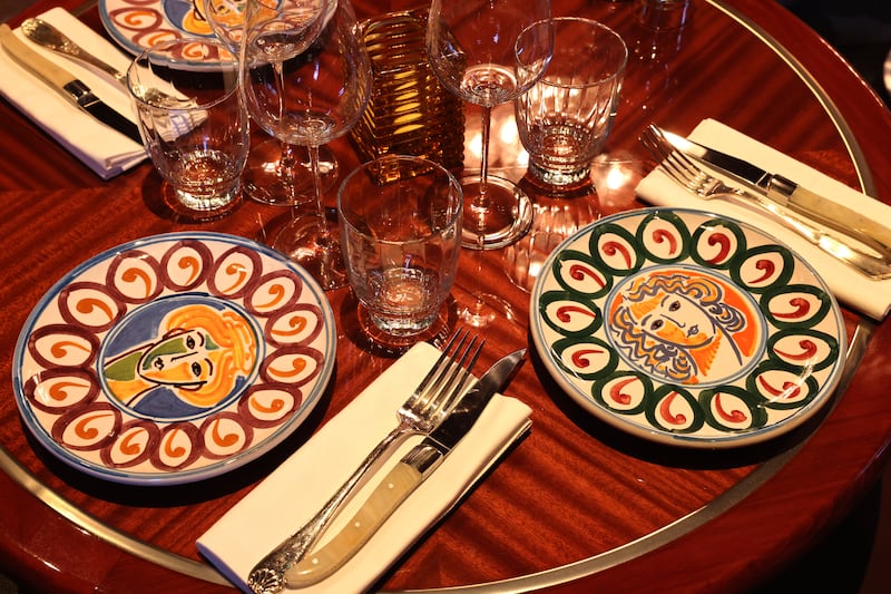 In Gloria Osteria Dublin, the deep wine red walls are a striking counterpoint to the magnificent Jacopo Foggini red glass chandeliers and the Rosso Levanto marble bar. On the walls, framed vintage Salvatore Ferragamo headscarves and pieces of costume jewellery jostle with 1960s photos of cool people doing cool things and even a priest’s vestment. Statues of dogs, mounds of red flowers and the group’s signature, brightly decorated handmade plates round out the look.