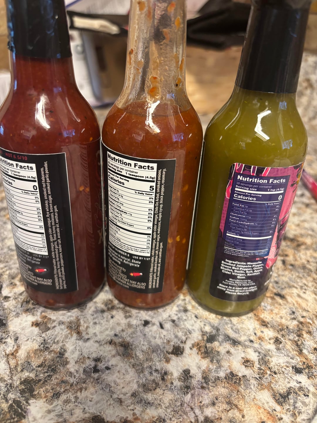 Left and center are by Tot Sauce. Far left is a collab with the metal band Skybaus (who was also in Dallas the night I bought these playing, and they’re based out of Dallas) but it’s pretty dang good. The center is almost like a hot sauce bbq sauce.
