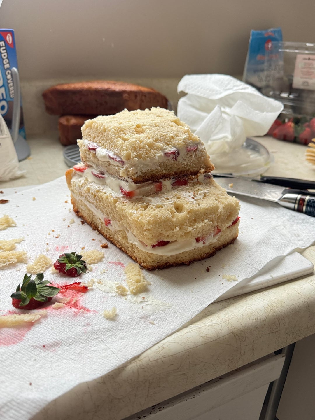 It’s a vanilla sponge cake with strawberry and mascarpone layers, and swiss meringue buttercream outside with more strawberries.