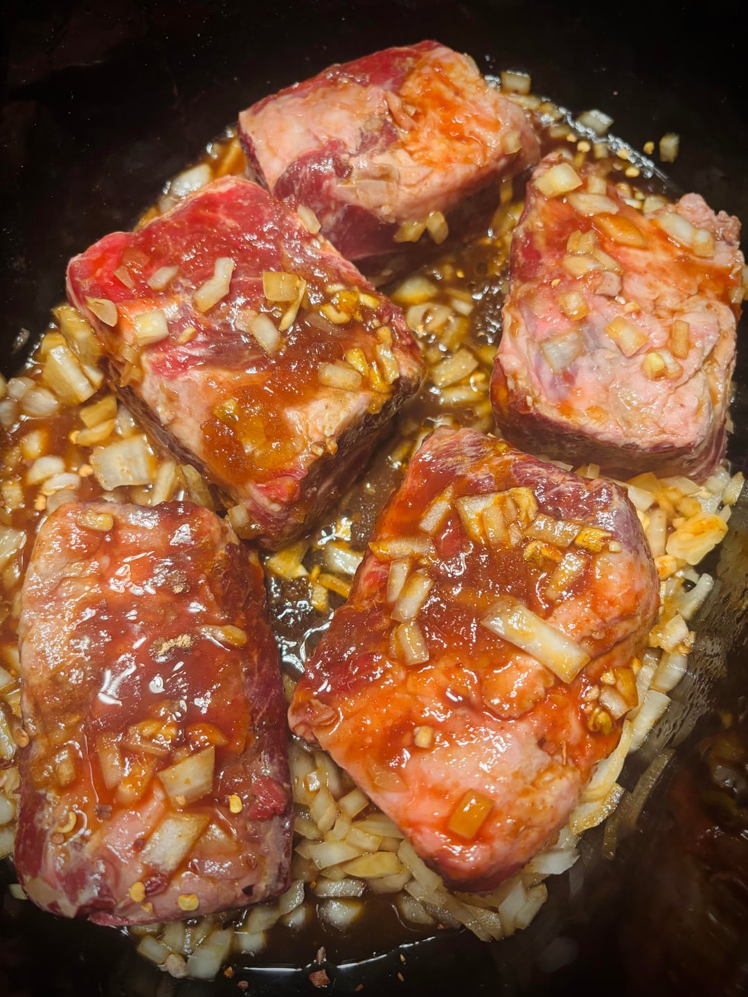 Cooked for 7 hours on low. It got a touch of sear on the cast iron after the long cook, and I reduced the cooking liquid on the stovetop to make a sticky sauce. Finished with toasted sesame seeds and scallions; served with pickled red onions, pickled cucumbers, carrots, and rice with butter lettuce.