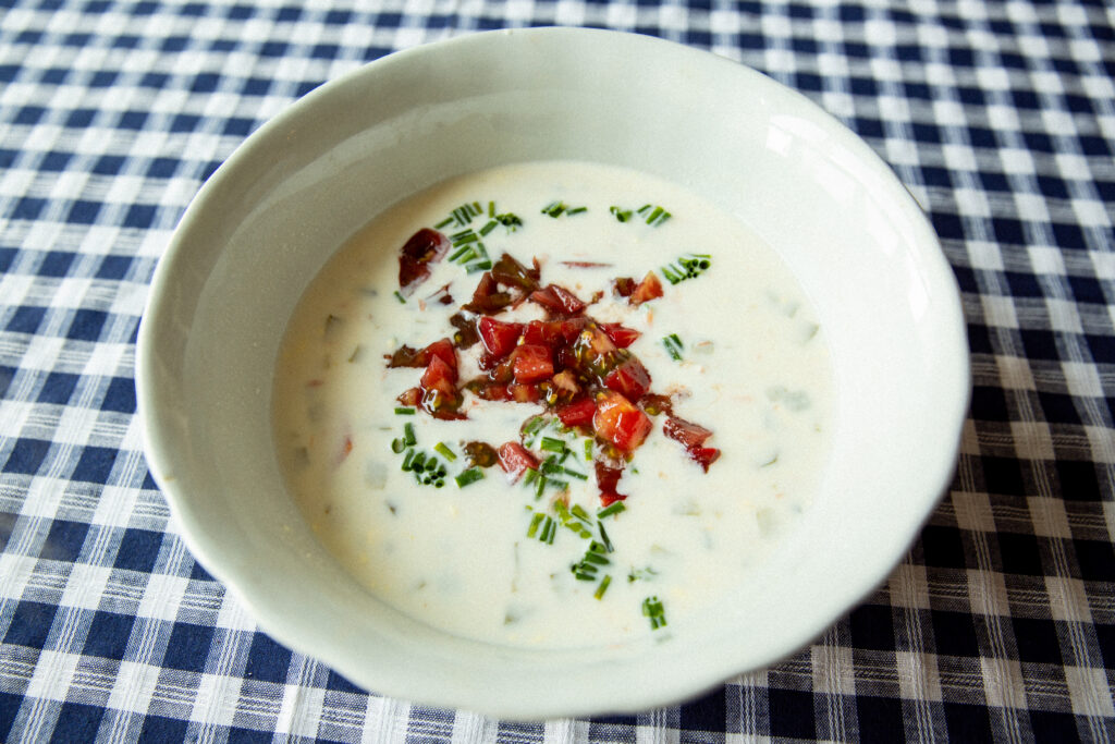 David’s talents, plus the keenness of vision inspired by her experiences of privation, have resulted in a uniquely powerful and lasting body of work that’s distinct from the contemporary food writing it might seem to thematically resemble. When Oset and Cuellar and I tried her food, we also found it to be different from what we’d expected, and different from food we’d had before. First, David’s promise of simplicity in putting the dishes together was borne out. There were small mysteries. She did not explain the answers to questions that were assumed knowledge, such as why the smoked fish for our soup needed to be cooked in milk. (Plus: How much fish, and for how long?) But even so, the dishes came together quickly. Even the intimidating-sounding rabbit terrine was a fairly hands-off matter of simmering the rabbit, pulling the meat, and putting it through a grinder with an equal amount of pork belly and some spices. Most of the dish’s time was in baking and chilling. The three of us were at the table, ready to dine, before we knew it. We did not picnic outdoors, but we discussed the plusses and minutes of the picnicking lifestyle, especially in summer—Oset and Cuellar had recently brought sandwiches to Valles Caldera National Preserve in New Mexico; our photographer for the evening, Erica MacLean, had tried to go to a park in Brooklyn, but got too hot and ended up drinking raspberry lemonade and watching Call Me By Your Name at home.