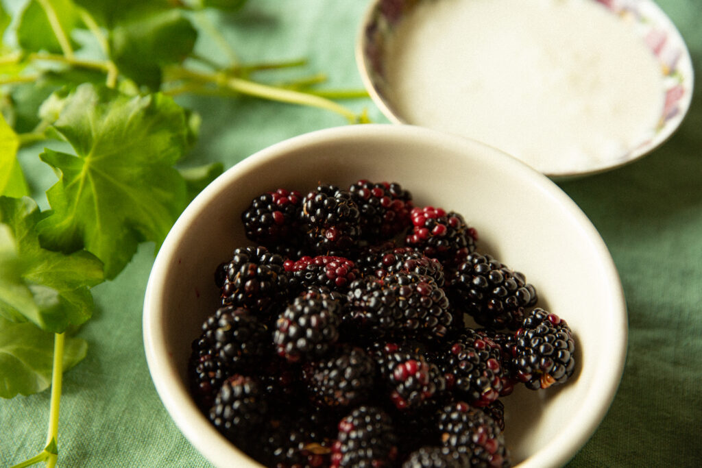 Put the cream into a saucepan, add the sugar and the geranium leaves, and steam gently, letting the cream get “thoroughly hot” but not bringing it to a boil. Cool and chill overnight. The next day, add the cream cheese and stir thoroughly to combine. Serve a dollop as a topping on a small dish of blackberries.