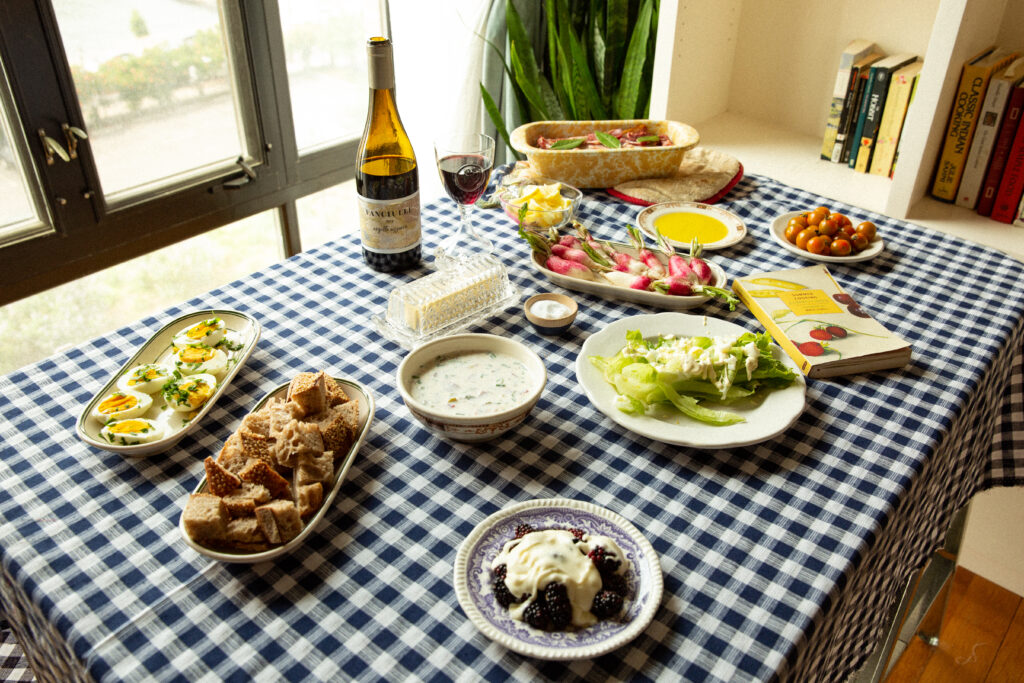 Even indoors, our food had a crispness, cleanness, and lightness we’d rarely encountered before. We buttered our radishes and dusted them with salt, popped sweet little cherry tomatoes into our mouths, and dipped bread in olive oil. The minimalist salad, served unsalted and decorated only with a creamy white dressing and chopped egg white, was particularly delicate and unusual. The cold fish soup tasted like a soup version of a bagel with lox in the best possible way. Our terrine was well seasoned, and rich but light. David was a wine enthusiast (rough or fine, she drank it all)—and one collection of her journalism in publications including Vogue, Punch, The Spectator and the Sunday Times is even called An Omelette and a Glass of Wine. For summer dining she often recommended “cheap,” “coarse,” “stout” stuff, and Chianti in particular. Sangiovese, the grape Chianti is made from, makes for a rich, full-bodied red wine that tastes intensely of cherries, and didn’t sound like a natural match for raw vegetables and a hot day. But I followed David’s advice, and my spirits collaborator, Hank Zona, recommended a bottle of Sangiovese from the small-batch Tuscan producer Fanciulle—not a Chianti but from the same grape. The wine, a 2019 Villaggio, was neither cheap nor coarse, but it was made from grapes from a single vineyard and tasted like the hyperlocal equivalent of David’s best meals. It went well with the earthy bread and the smoky flavor of the rabbit terrine, and tasted intensely of cherries, blackberries, and spice.