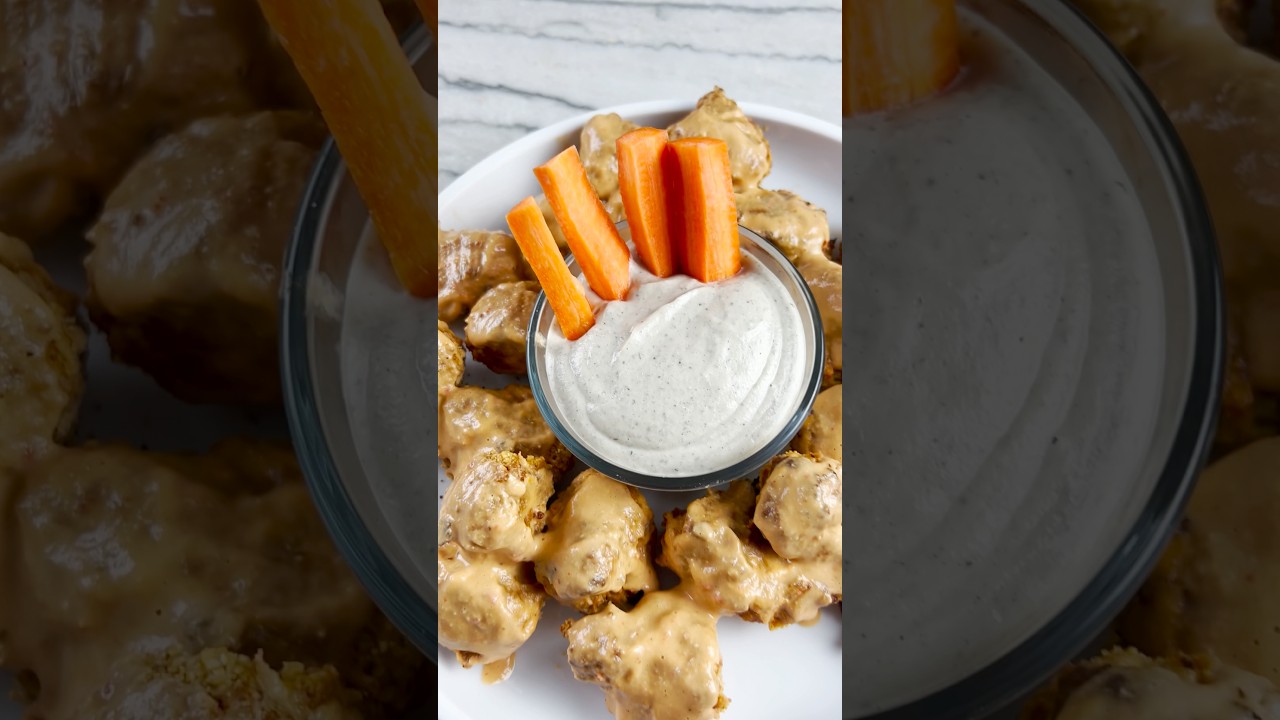 Another fun, healthy vegan creation. You know, when I first made these, I didn’t think that cauliflower could taste so good, but it does with this recipe. And keep in mind, I’m using no oil and no wheat. And it’s easy to make, too. Once you get your cauliflower battered in the oven, you simply whip up some of my golden barbecue sauce, brush it on, and you’re done. And so are these when I get a hold of them. So save the recipe and make your own. [Music]