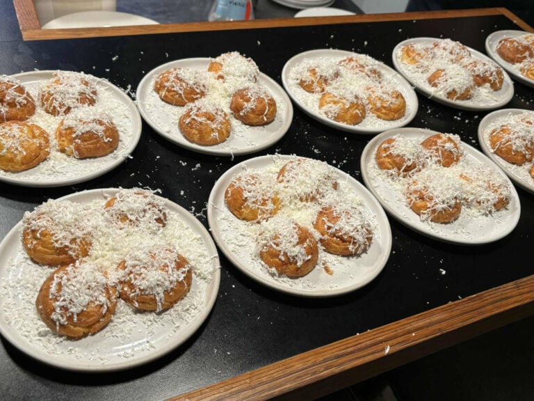 This was to be our first tasting of the evening – a bottle of Brut Cuvee vintage 2022 from the Domaine Karanika winery at Amyntaio in Macedonia. Jay explained that the wine was made from mostly ungrafted xinomavro grapes combined with assyrtiko grapes. This is a word class sparkling wine, getting rave reviews by champagne experts.
