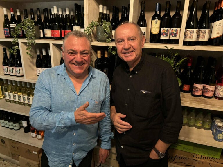 So much wine to choose from – Achilles Kalanis and Steve Tsaganas discussing the finer points of Greek wine on the night. Photo: Jim Claven