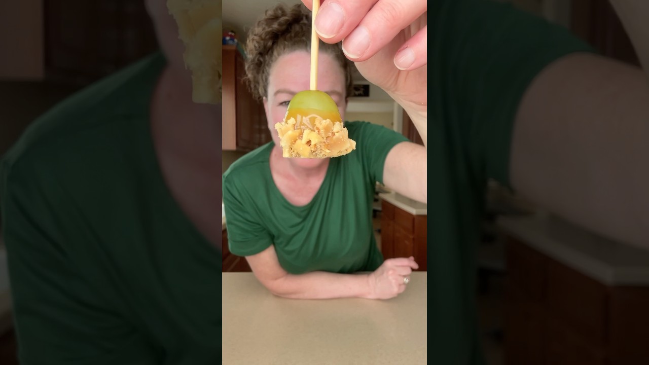 These caramel apple grapes are one of my favorite things in the fall and for Thanksgiving. They’re super easy to make, loved by everyone, and they really do taste like a little caramel apple in every bite. And before you freak out over the name caramel apple grapes, if you can’t see the correlation between these two, I can’t help you. You need green grapes. Make sure that they are rinsed and dried. Take a cocktail toothpick and poke it into your grape, but don’t go all the way through. You need soft caramel candies, about a cup, and you got to unwrap them. You’re going to put those in a small pot over medium low heat along with two tablespoons of heavy cream. The cream helps the caramels melt better so that it’s nice and smooth. Once this is melted and smooth, you want to turn down your heat to the lowest setting just to keep it warm. Using the toothpick, you’re going to dip the grape in the caramel sauce, letting any excess drip off, and then immediately dunk it in crushed peanuts. If you don’t like nuts or you’re concerned about allergies, you can replace the peanuts with cookie crumbs or graham cracker crumbs or coconut flakes or even toffee bits. That way, everybody can enjoy them. Do this for all the grapes that you’re using. Put them on a plate to set and just know that they do dry very quickly. I can’t explain it, but they really do taste like a little caramel