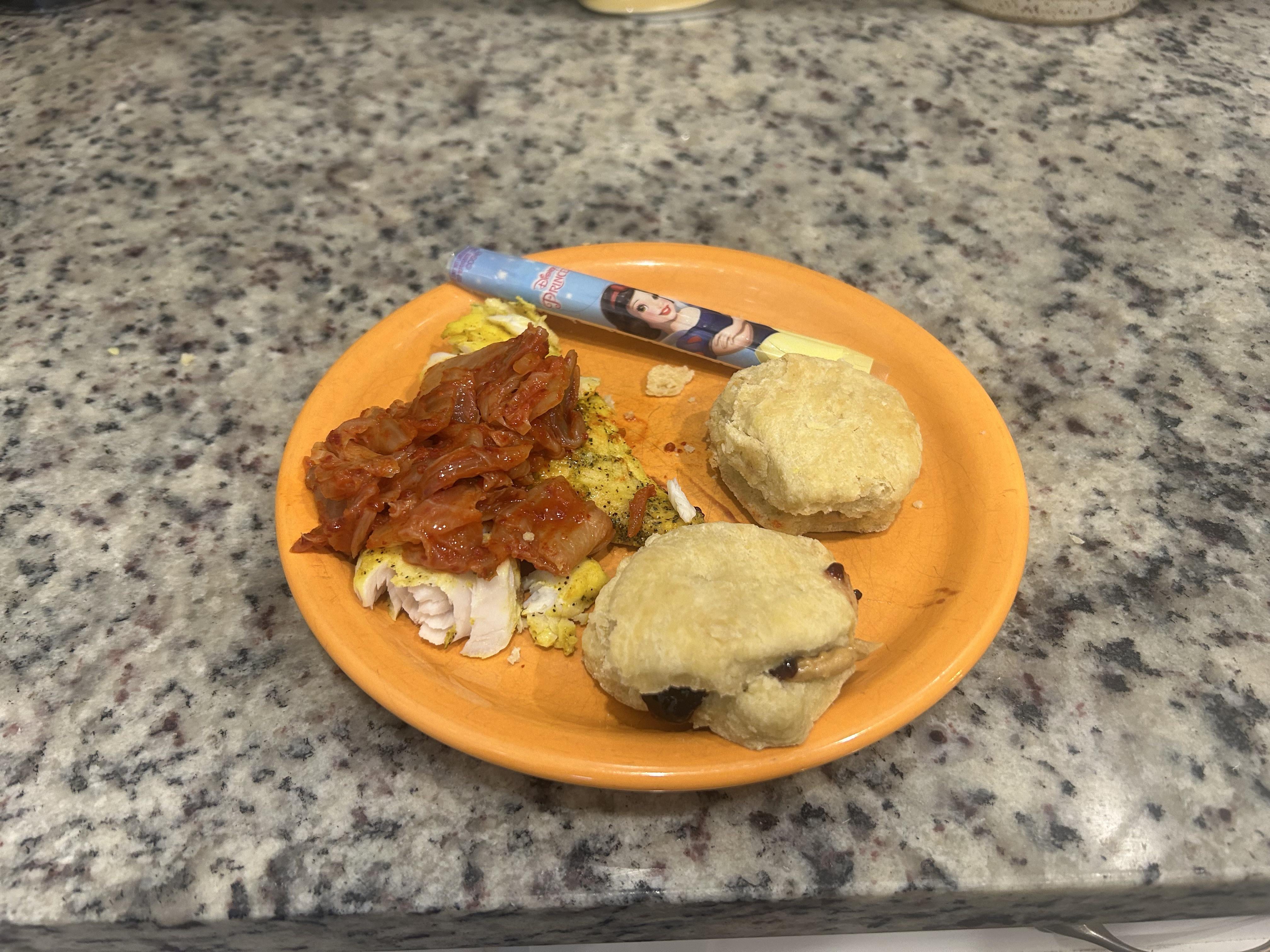Cold tilapia with kimchi , wife’s sourdough biscuits with pb & jelly plus a Disney princess cheese stick by SmugCichlid 2 Comments supperfash 6 hours ago Even the borg would not assimilate this. porp_crawl 3 hours ago From the preview pic, I thought that was a pile of bacon on scrambled eggs with those biscuits.And a Disney Princess vape.