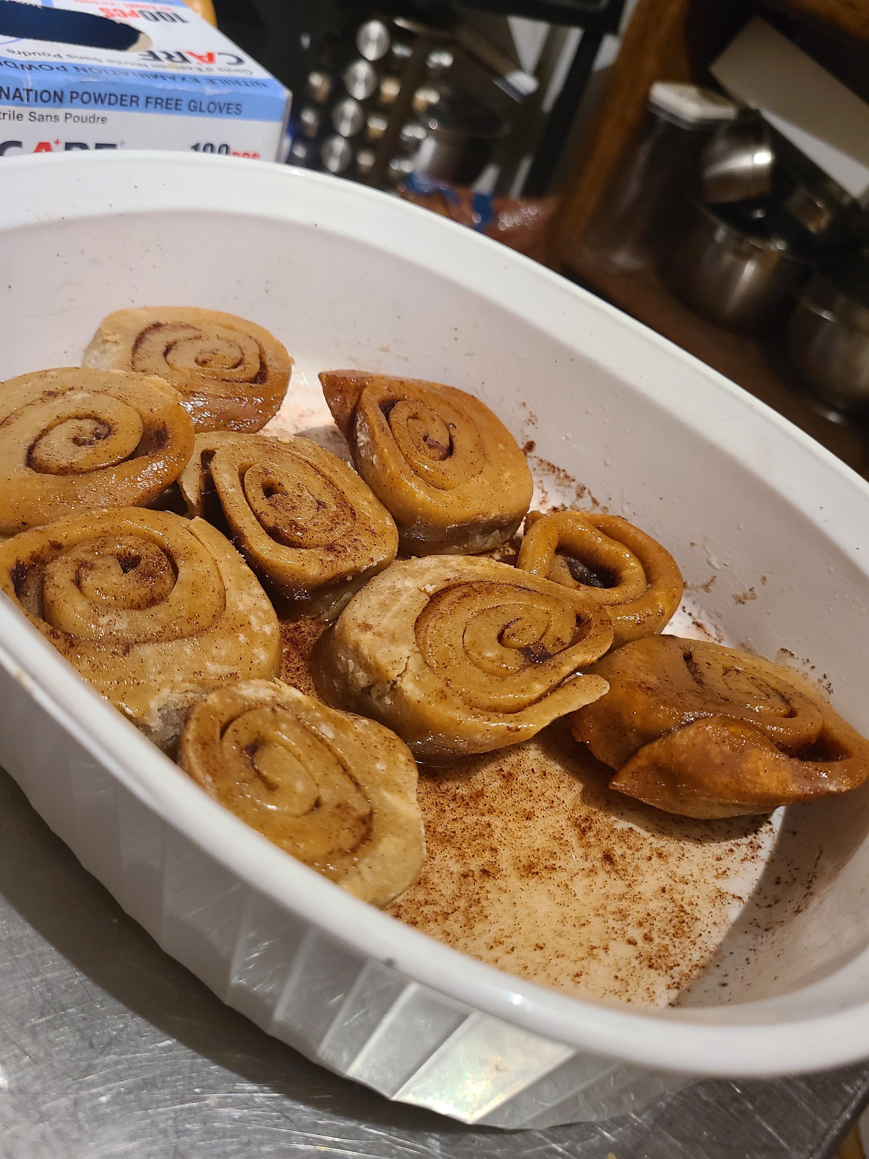 They tried to make them from scratch. I had a small bite of these cinnamon rolls. They were dry and hard asf.