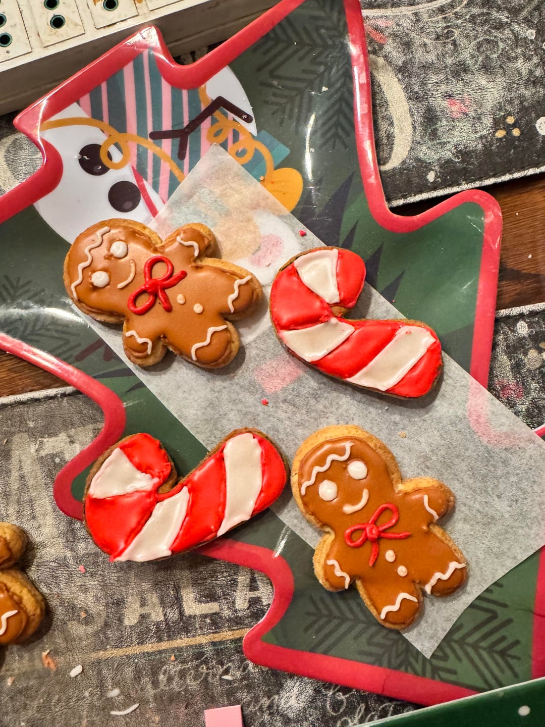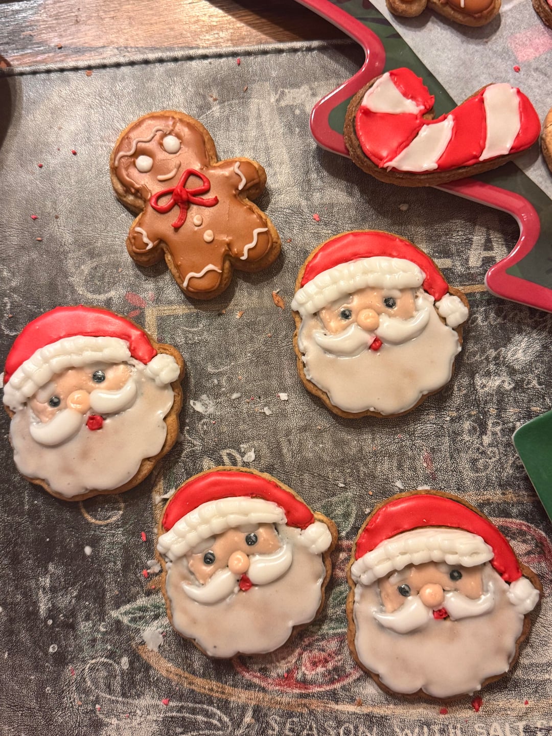 Add white to all your colors so they are more opaque. It appears that your outline icing is either too thick or has dried too much before flooding. Your flood icing is too thin. Work on your piping technique so you have better control of your lines (practicing lettering is a great way to do this). Are you using a scribe tool to settle your icing? If you are, it might be the consistency of the icing. If not, you should watch some videos of how to use a scribe and try that. Your gingerbread man has those crack lines because it dried partially and then was moved (looks like it may have been dropped or jostled, it’s sad when this happens, but can’t really be fixed the way you tried to here). Flood larger areas first and then adjacent smaller areas (the Santa eyes).