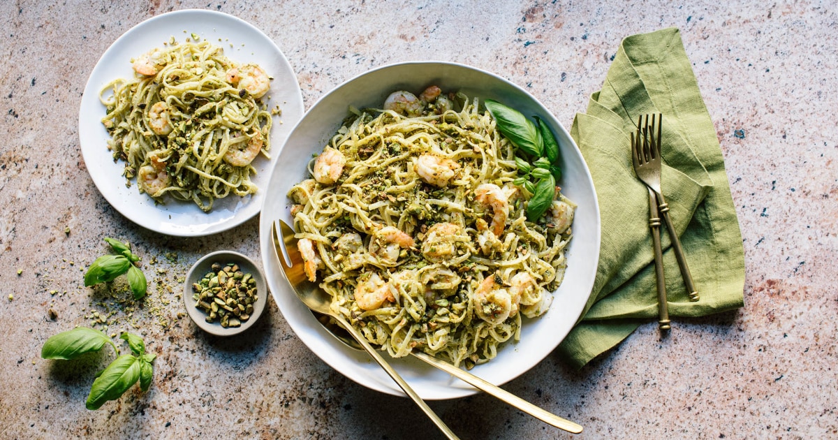 If you love Italian food and seafood, there’s nowhere better to eat than Liguria. The Northern Italian region’s coastline is home to some of the country’s brightest fare, including its most famous dish: pesto. I spent a month in Liguria a few years ago and was surprised to see not only the classic version — made with olive oil, basil, pine nuts and Parmigiano-Reggiano — but countless variations. For this easy pasta recipe, I’m doing my own twist on the classic by tweaking two ingredients. First, I swapped pine nuts for pistachios for a stronger and more distinct flavor. And then I replaced the Parmigiano with mild ricotta. The ricotta and pistachio together allow all the nuttiness to shine through the pesto, while a hit of lemon marries it seamlessly with briny shrimp.