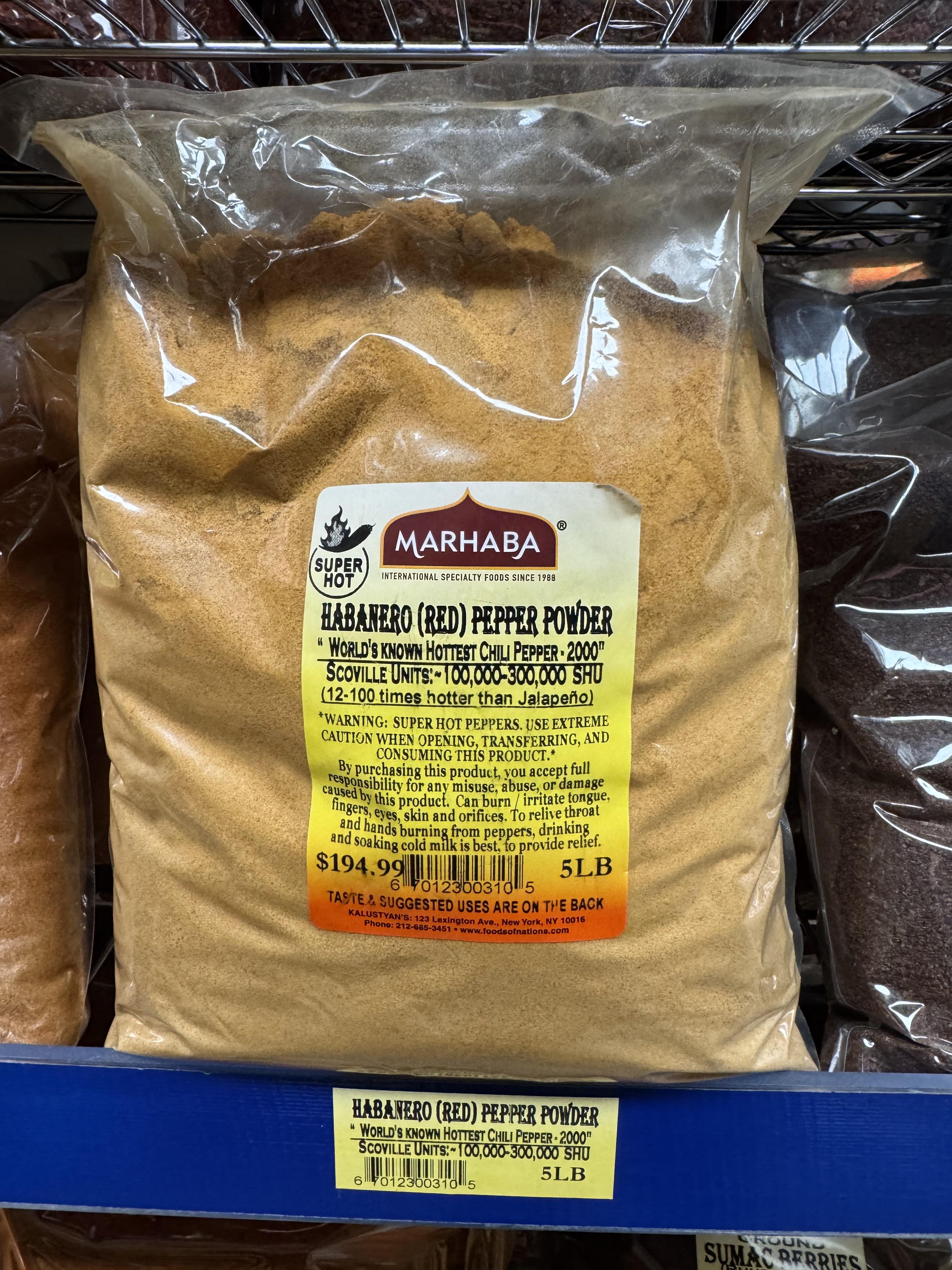 … I stopped by Kalustyan’s because they’re known for their hot sauce selection— which is quite good, not the biggest ever but a lot of great choices there— but got sucked into looking at the rest of the store… where I found this 5 Lb bag of habanero powder for $195… they’ve got a room with nothing but dried peppers and pepper powders. That place is just nuts. I wish I could get there more often.